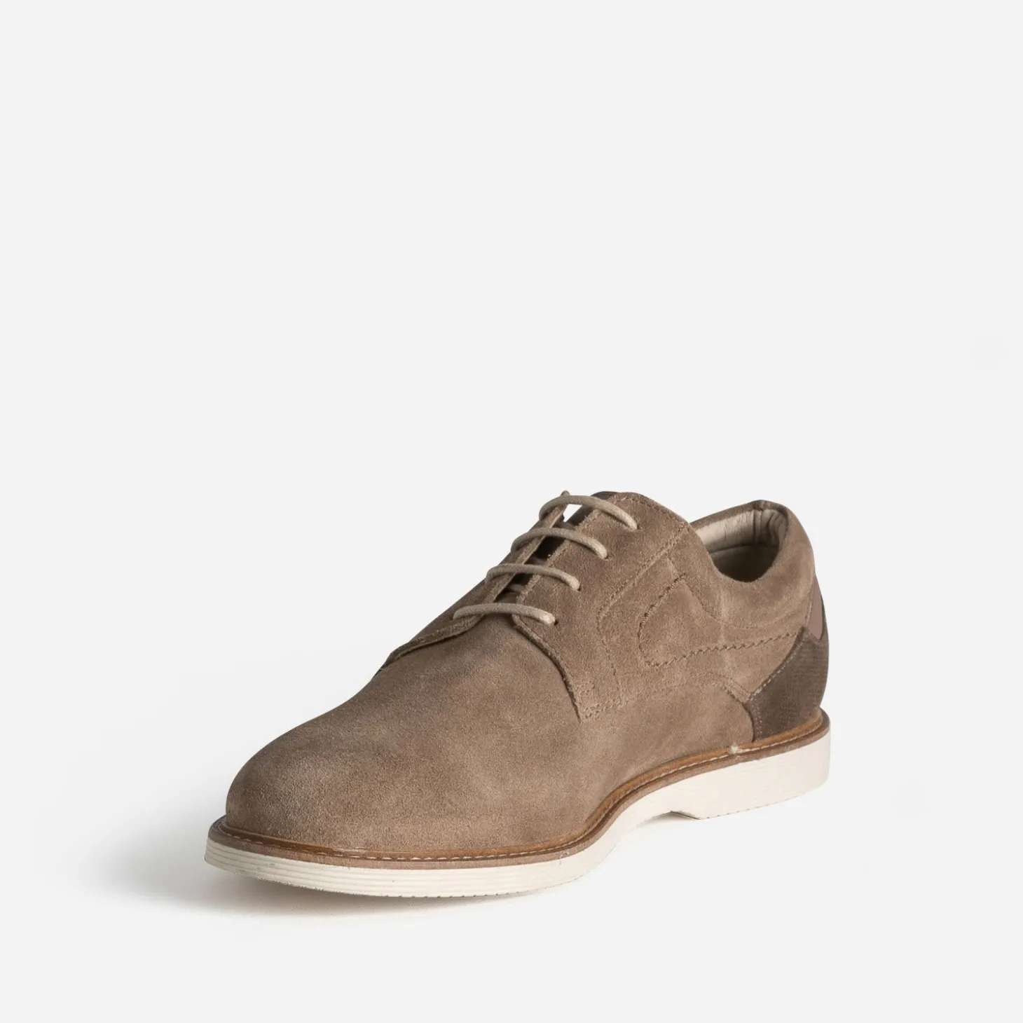 Focus sur le derby pour homme. Habituellement réservé aux costumes et tenues formelles, il s’offre une version plus décontractée. D’abord par sa confection en cuir velours. Ensuite par son coloris taupe. Enfin par sa semelle confort rainurée. Un modèle à privilégier avec des nuances de beige et gris, en polo ou chemise, en pantalon chino ou bermuda.