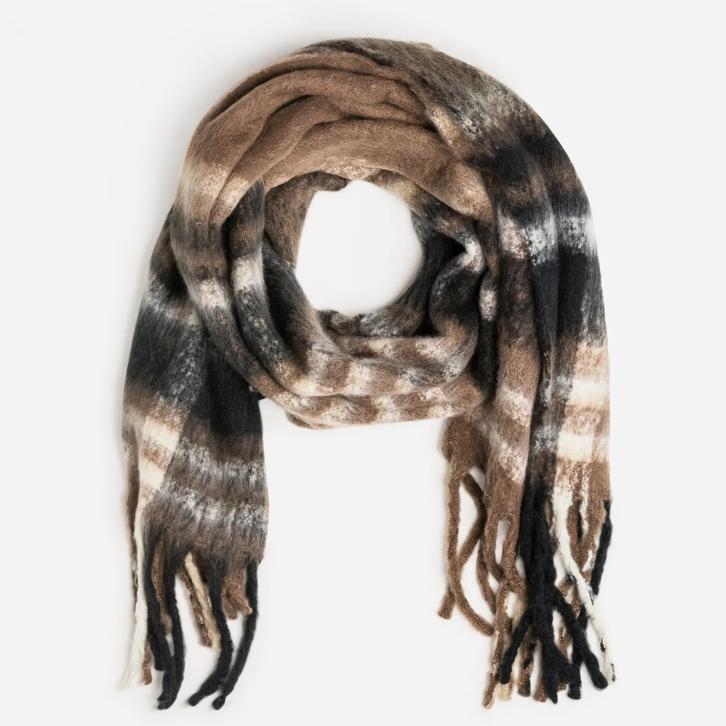 Maxi dimensions et maxi douceur pour cette écharpe pour femme. Sa matière duveteuse apporte la chaleur qui manque aux journées d’hiver. Ses couleurs se déclinent autour du marron, du noir, du beige et de l’écru, avec un motif rayures croisées. Un accessoire à rouler autour du cou, sur un long manteau dans les mêmes tons.