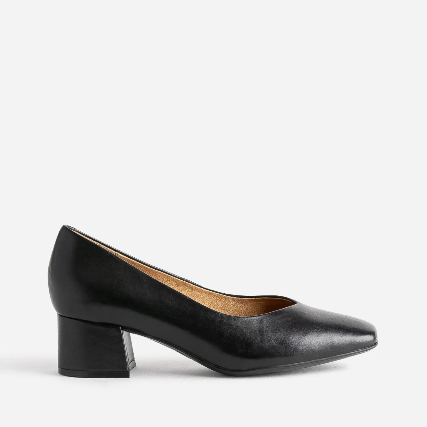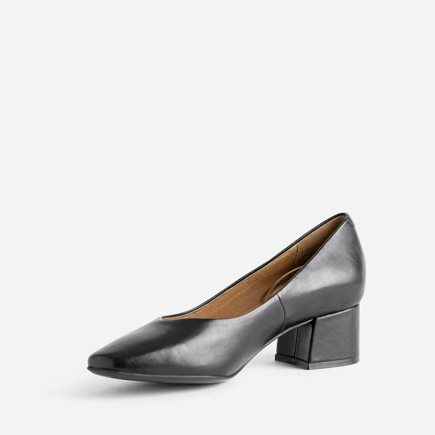Conçu en cuir lisse noir, cet escarpin pour femme séduit par son bout carré, son décolleté en V et son talon fare de 4,5 cm, idéal pour trotter toute la journée. Un modèle au design épuré, pour des looks formels et sobres.