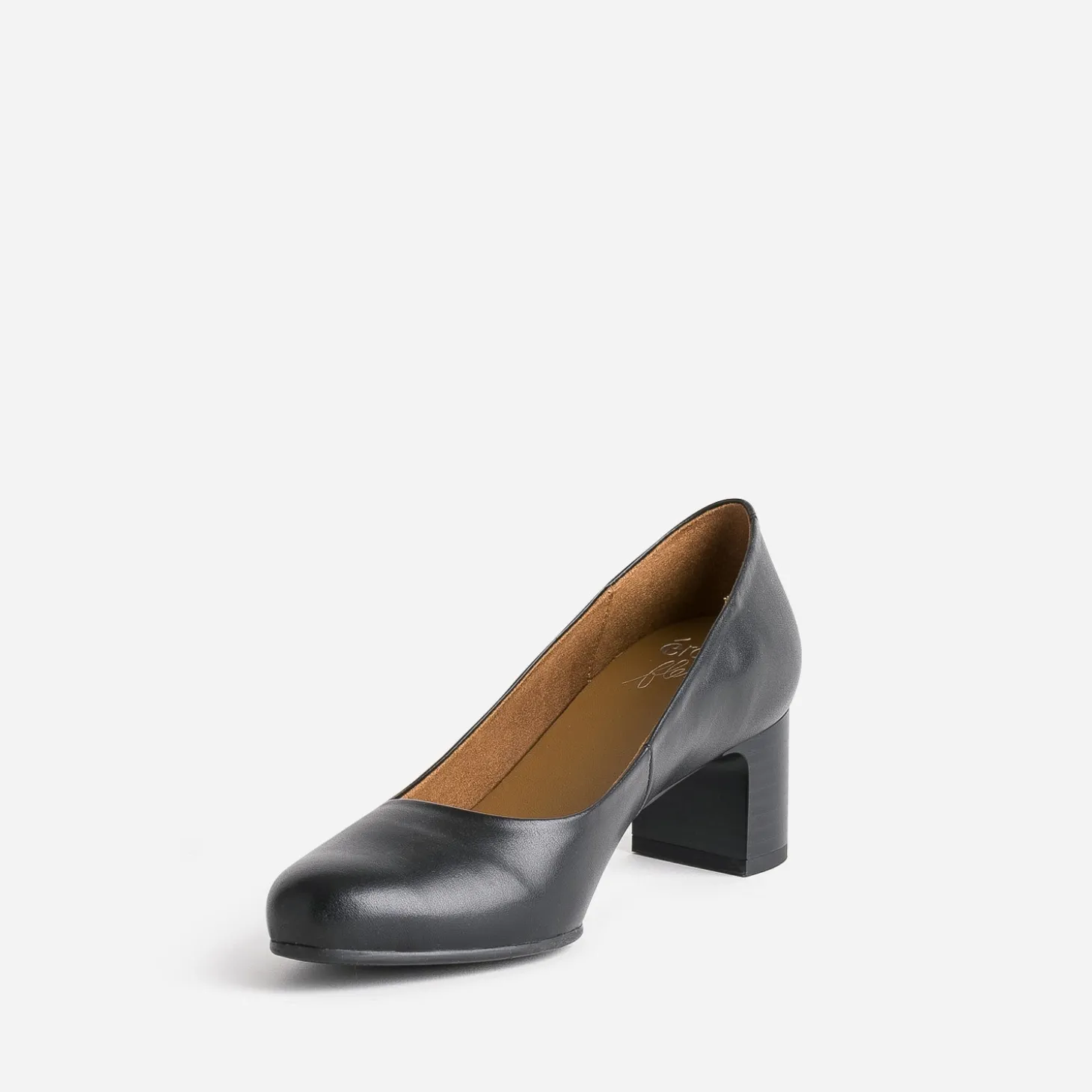 S’il ne fallait qu’une paire, ce serait celle-ci. Cet escarpin, basique et toujours efficace, séduit par sa ligne épurée et très féminine. En cuir lisse, il se décline en coloris noir, sobre et intemporel, avec petit talon conique imitation bois de 5,5 cm. La semelle amovible intérieure est reconnue pour ses propriétés d’amorti, de respirabilité et de durabilité.