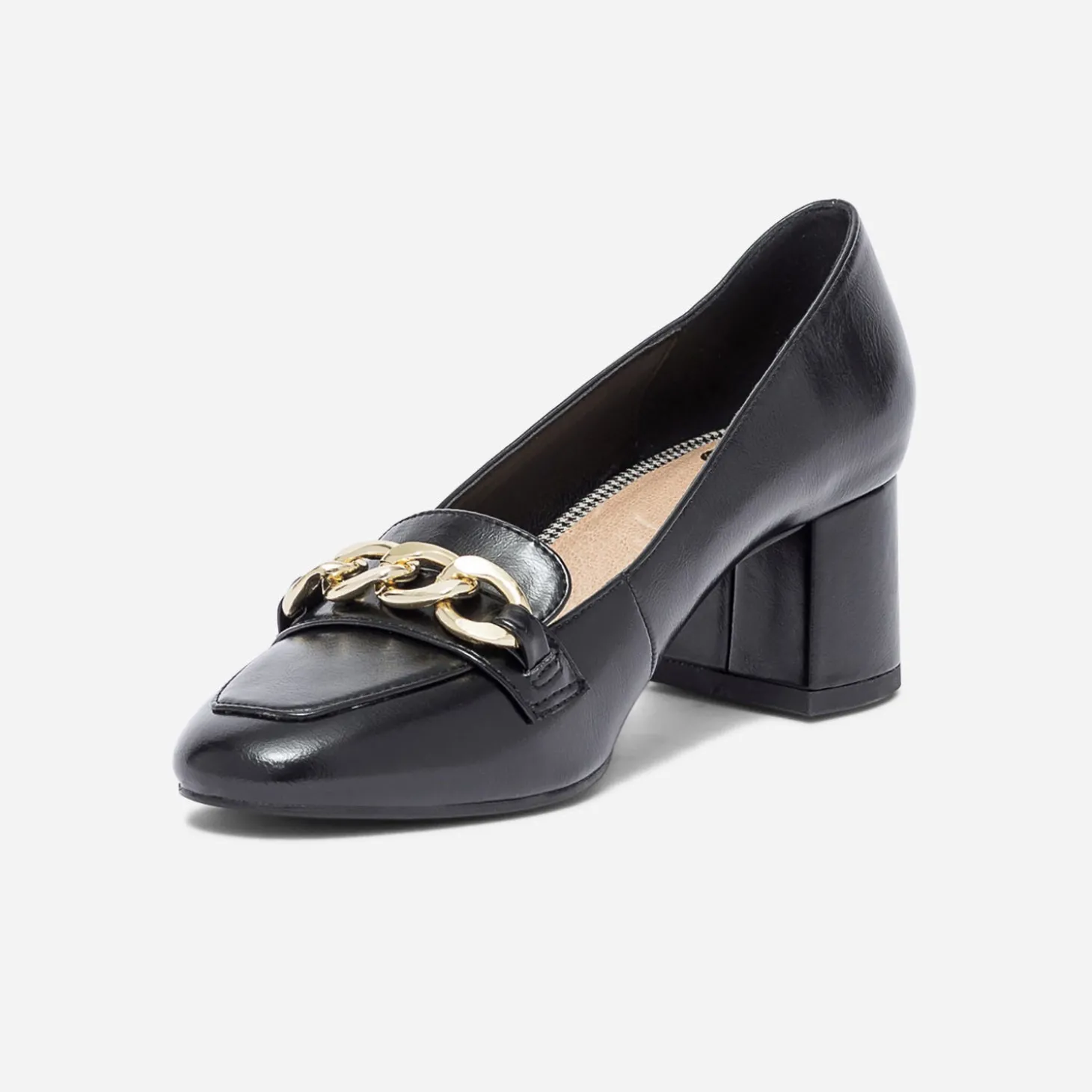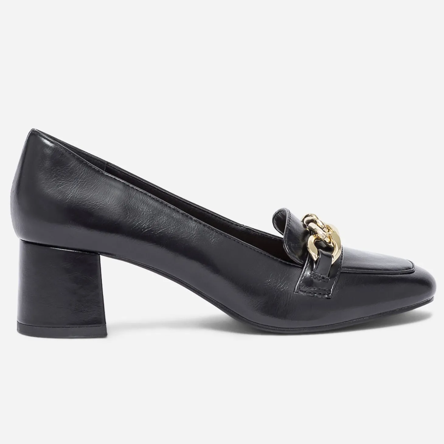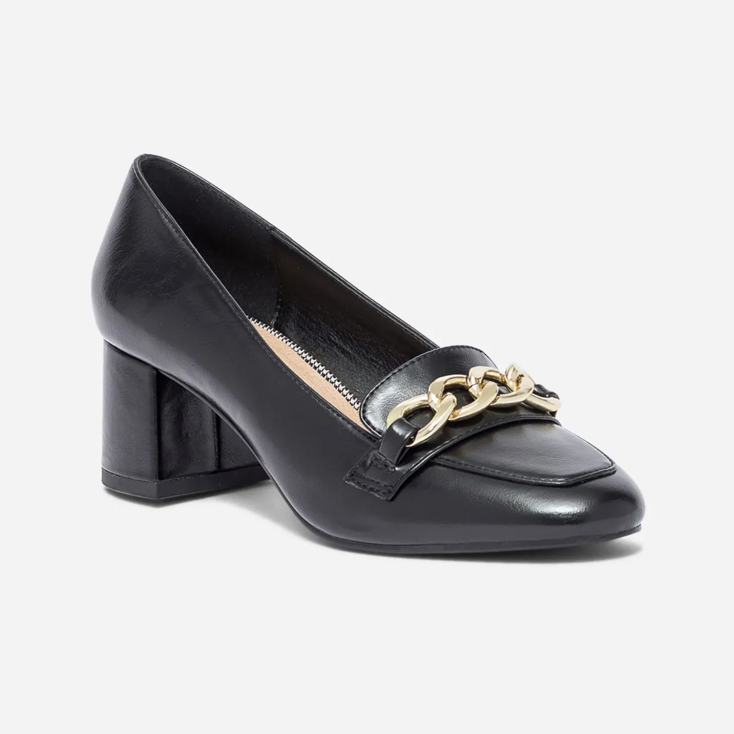 Monté sur un talon de 5 cm et décoré d’une grosse chaîne-bijou sur le dessous du pied, le mocassin surprend par son style. En matière synthétique noire, il défend une finition glacée qui lui apporte beaucoup de chic. Un modèle féminin, à partager avec un nouveau tailleur veste et jupe plissée.