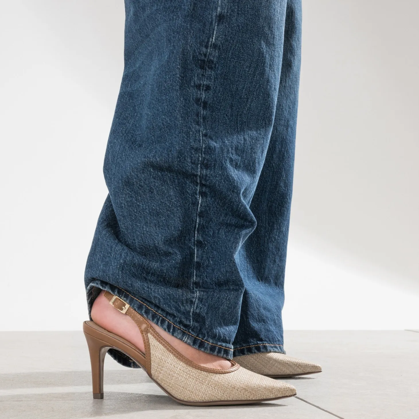 Avis aux fans des escarpins et des talons fins. Jetez votre dévolu sur la slingback, qui dévoile le talon avec élégance. Bout pointu et talon fin de 8 cm, elle est confectionnée en raphia tressé beige, souligné d’une bordure camel, prolongée par une bride. Un modèle idéal pour l’entre-saison, à tester avec un pull à manches courtes et un pantalon large cropped, dans un monochrome beige.