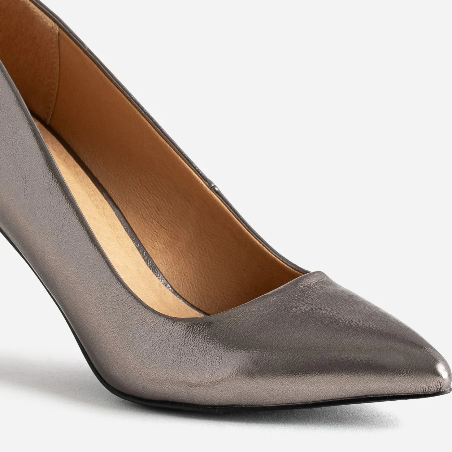 Time to glam’ ! Avis aux fans de talons hauts de 8 cm : cet escarpin femme sublime la silhouette instantanément. Argenté, il présente une finition métallisée qui renforce son côté chic. Robe de soirée ou look rock, il est l’heure de vous faire remarquer.