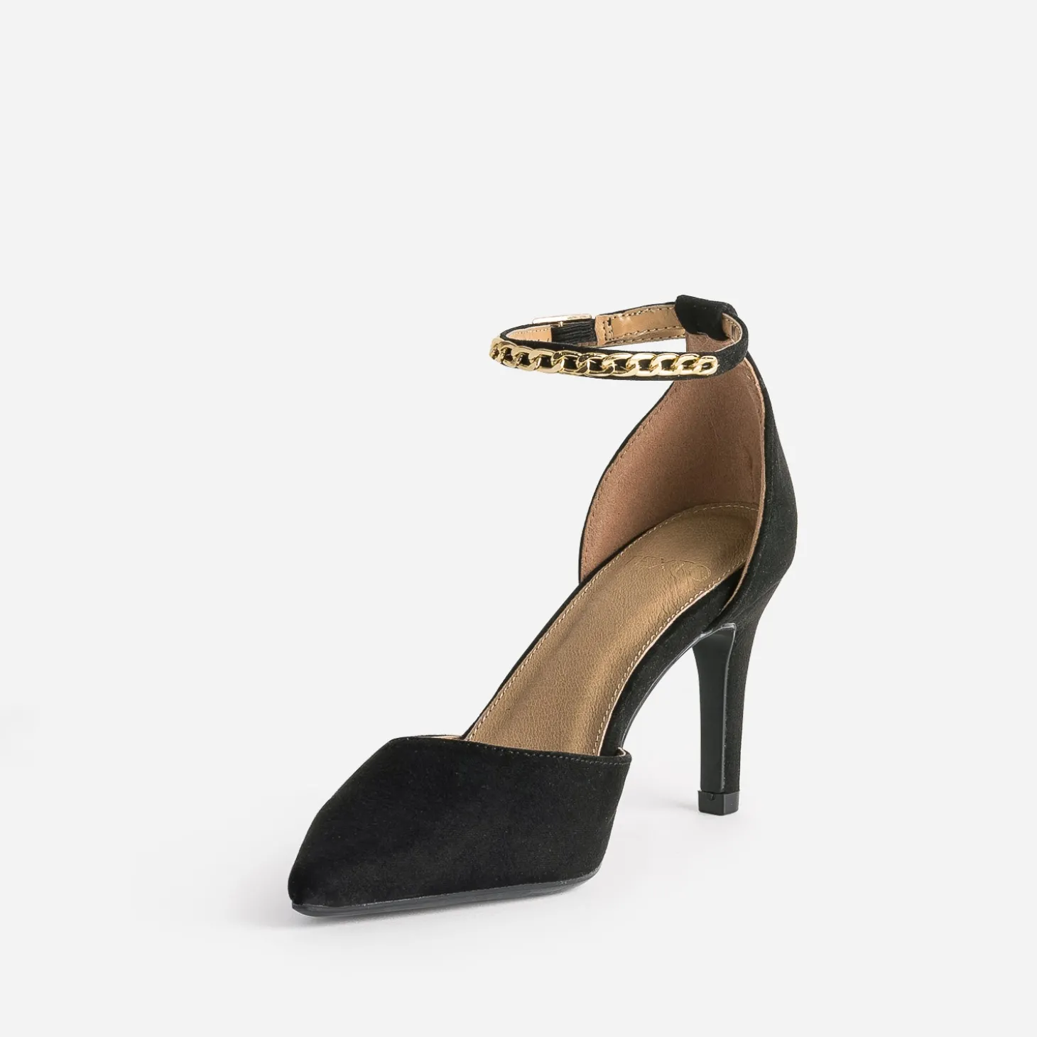 Vous cherchez comment sublimer votre pied ? Essayez cet escarpin femme. En textile suédé noir, il présente une première en cuir. Son atout mode, c’est la fine bride décorée d’une mini-chaîne en métal doré, qui vient autour de la cheville. Un modèle à privilégier avec une robe, une jupe ou un pantalon cropped, pour profiter de ce détail chic.