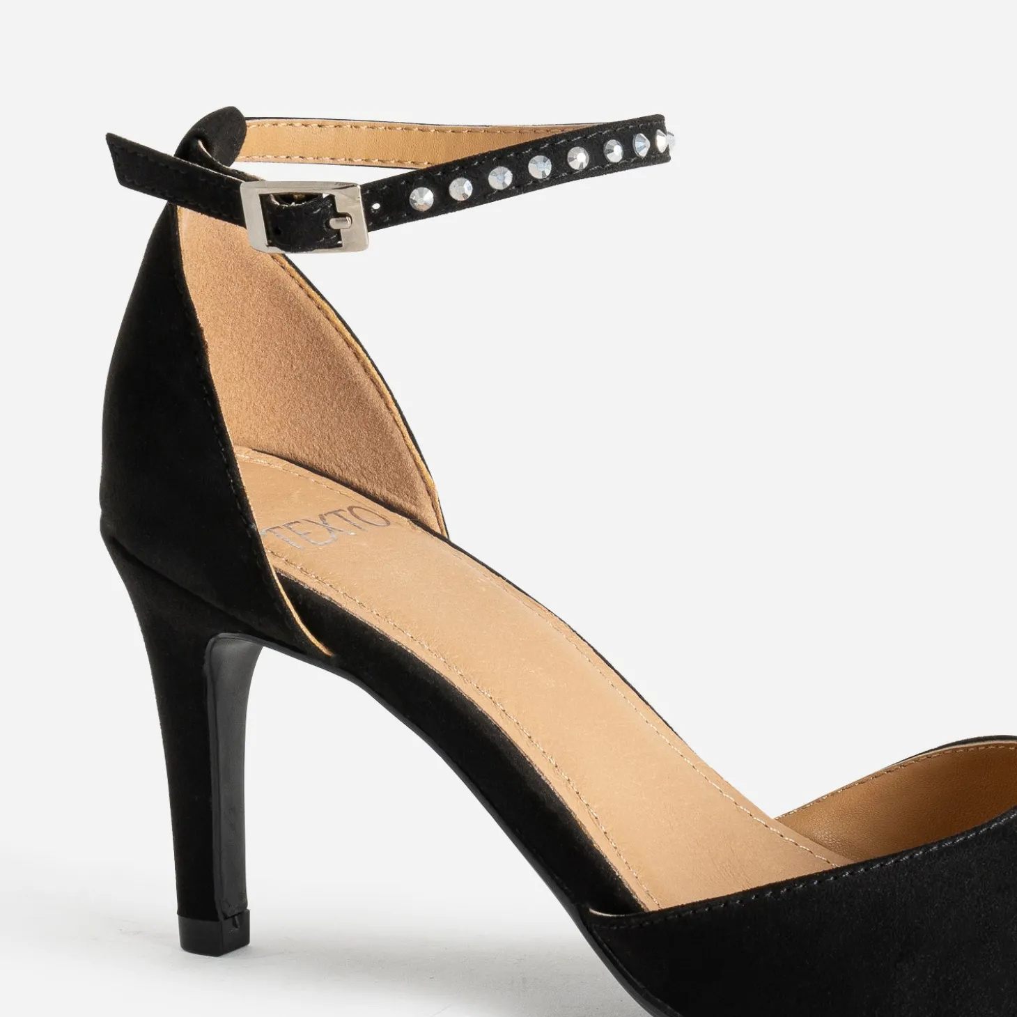 Vous cherchez comment sublimer votre pied ? Essayez cet escarpin femme. En textile suédé noir, il présente une première en cuir. Son atout mode, c’est la fine bride décorée de strass, qui vient autour de la cheville. Un modèle à privilégier avec une robe, une jupe ou un pantalon cropped, pour profiter de ce détail chic.