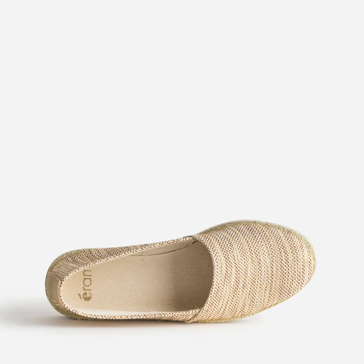 100% textile, l’espadrille est la chaussure d’été par excellence. Elle séduit par le dessus beige tressé avec rayures marron, jaune et doré, souligné d’un galon en croûte de cuir irisé sur le contrefort. Montée sur une semelle légèrement plateforme recouverte de corde, elle inspire des looks casual, twistés d’une pointe de chic maîtrisée.