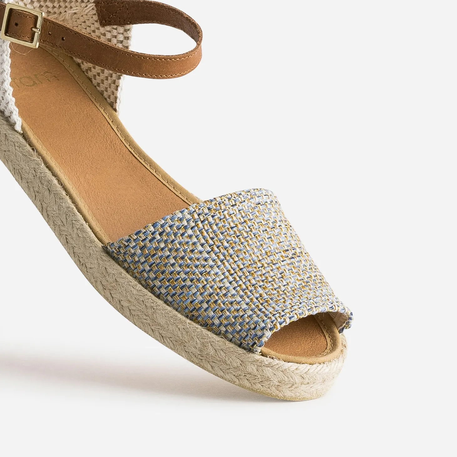 Joli jeu de tressage étudié pour cette espadrille femme revisitée. Version sandale, elle laisse apparaître le bout des orteils par une découpe, sous large bride fantaisie dans les tons de bleu et de beige et est maintenue par une fine bride à la cheville. Privilégiez-la avec une tenue décontractée, autour du denim ou du lin, dans les mêmes teintes.