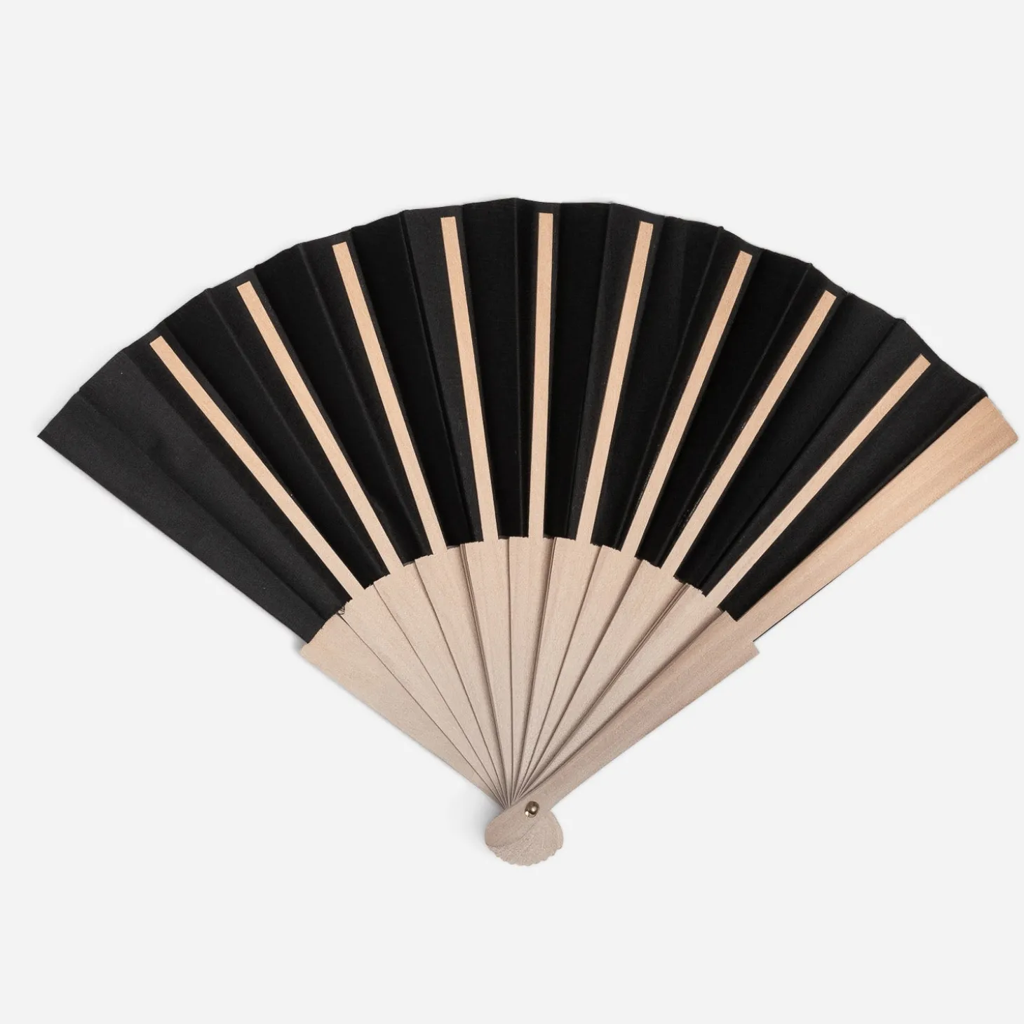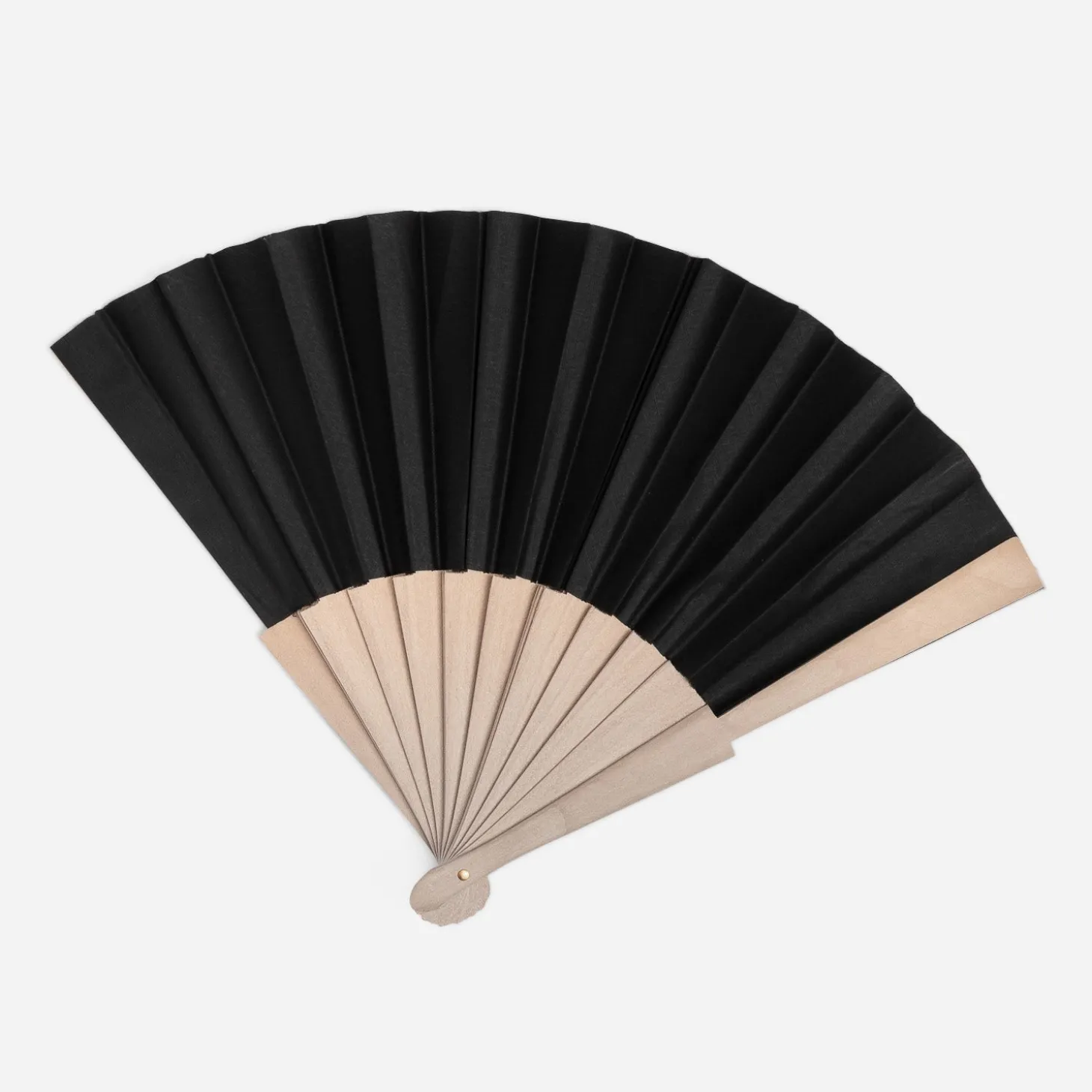 Affrontez la chaleur avec style grâce à cet éventail bi-matière. En papier noir et bois clair, il apportera une touche d’élégance à vos tenues estivales. Dimensions (ouvert) : 23 cm (h) x 43 cm (l).