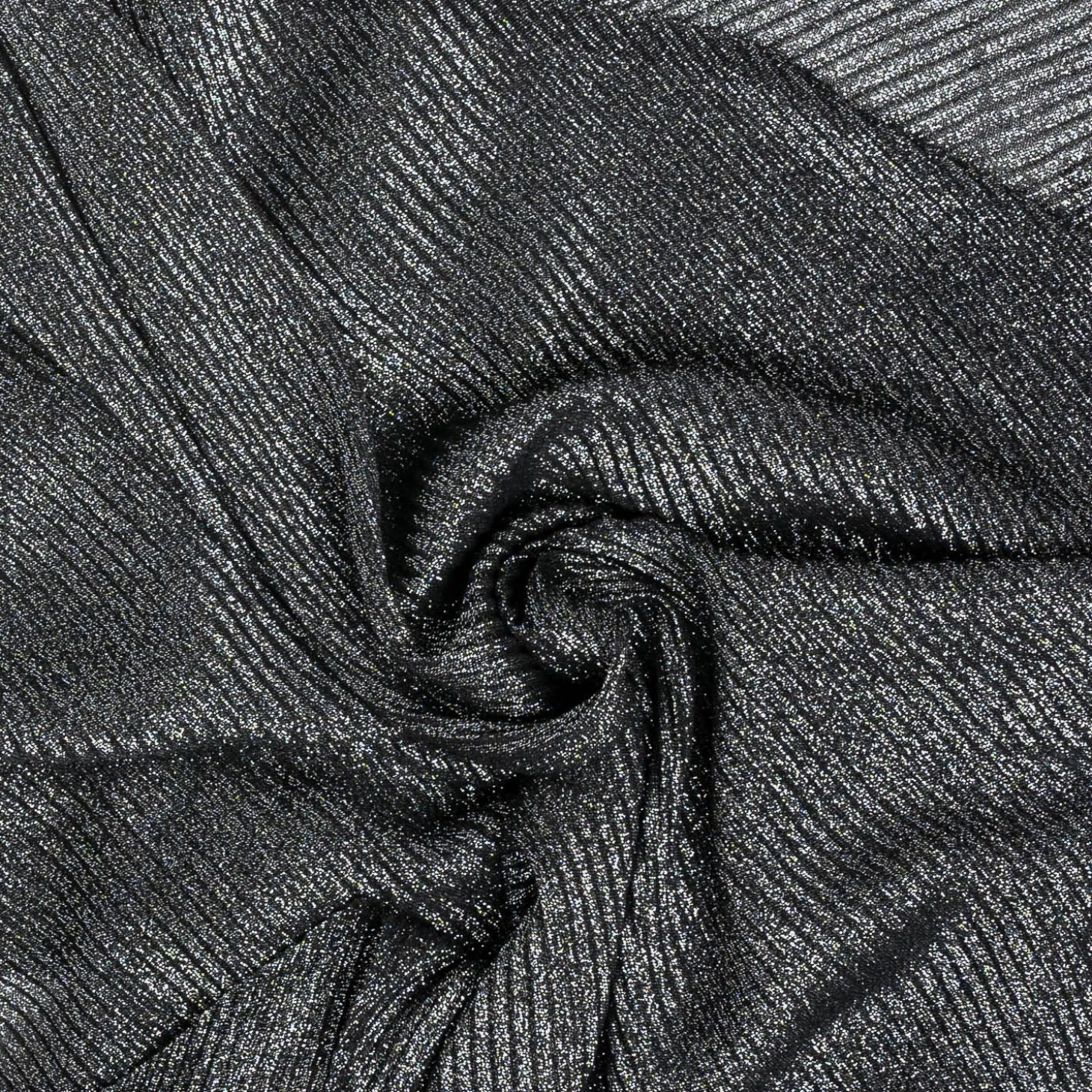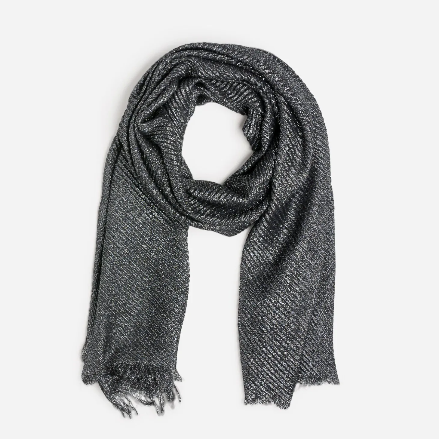 Ce grand foulard a le pouvoir de twister n’importe quelle tenue, d’une touche indéniablement chic. Noir, il est réveillé de fibres métalliques argentées et reprend le plissé soleil toujours très à la mode. Un accessoire à associer avec un total look noir ou gris.