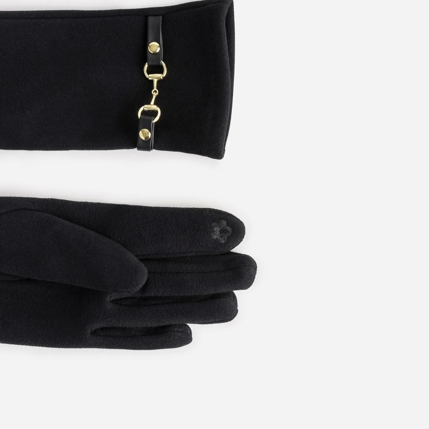 Décorés d’une patte inspirée du mors, habituellement sur les mocassin et placée ici sur le poignet, ces gants noirs pour femme gagnent en chic. En textile, ils possèdent une fleur brodée sur le dessous du pouce et de l’index, permettant d’utiliser le smartphone de façon tactile, sans les ôter.