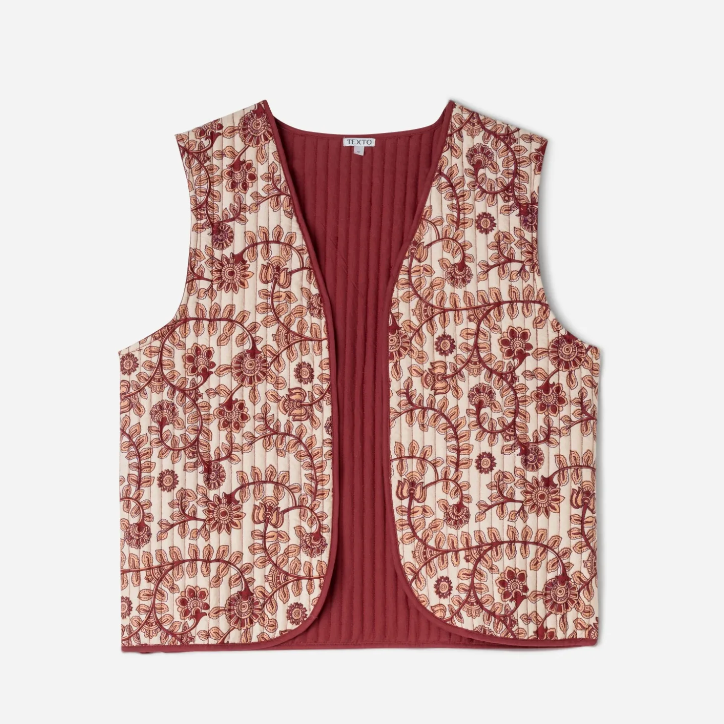 Forme droite, encolure V, sans manches, imprimé fleurs indiennes, surpiqûres pour effet matelassé, sans fermeture, réversible.