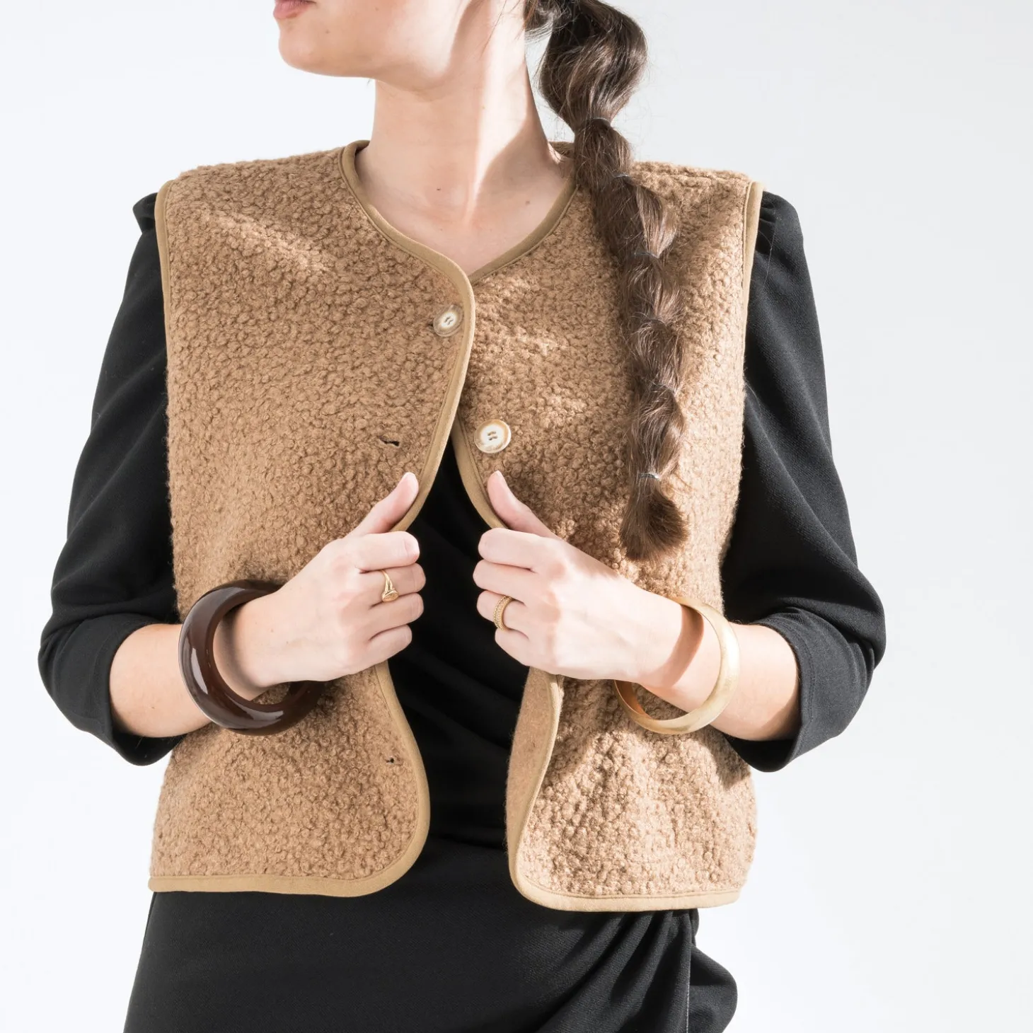 Vous connaissez le layering ? C’est une tendance qui consiste à superposer les vêtements, avec un style étudié. Le gilet sans manches n’y fait pas exception : en textile sherpa camel façon bouclette, il vient réchauffer les looks de la saison. Un modèle à associer avec des teintes naturelles et des matières cosy.