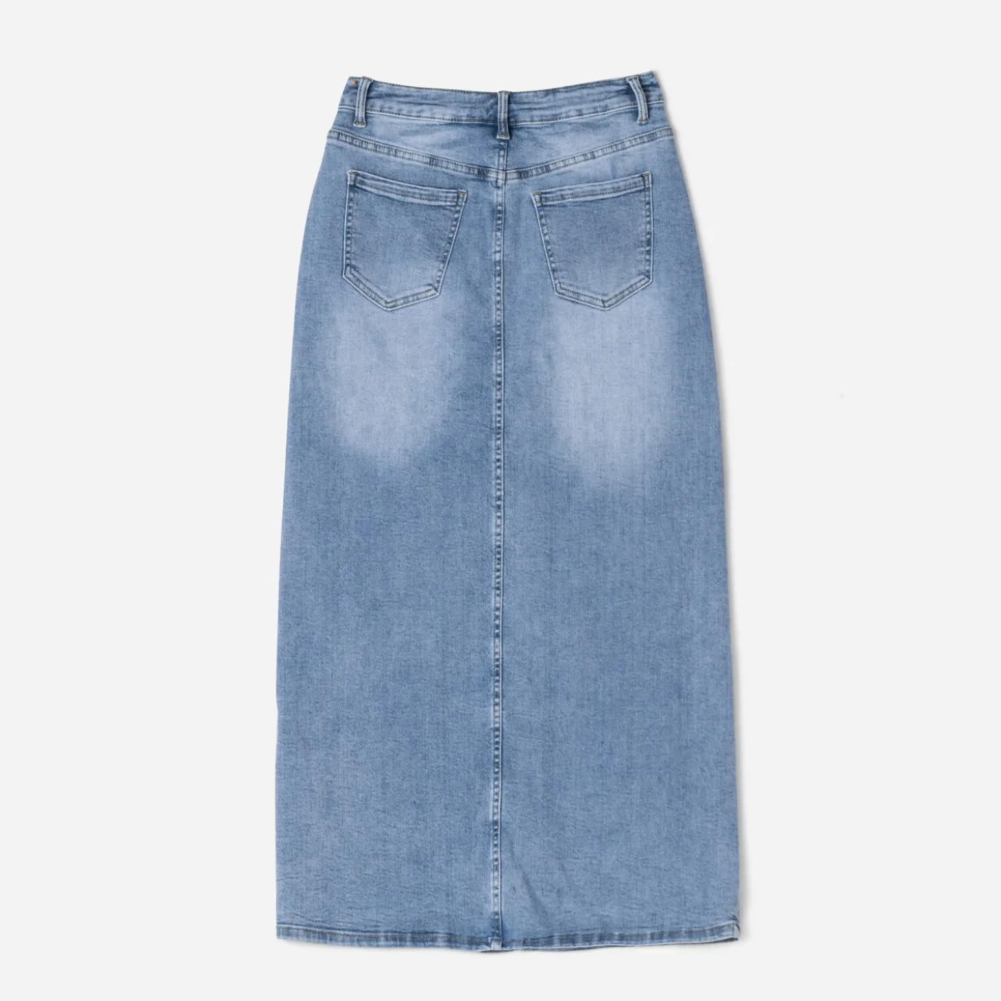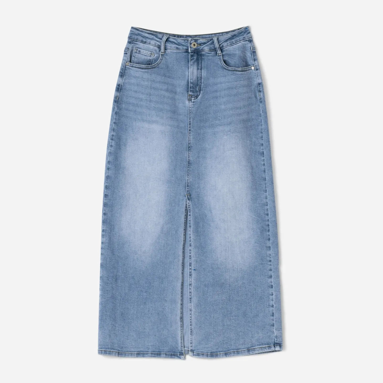 Revoir ses classiques permet de rester à la pointe des tendances. C’est la proposition de cette jupe en jean bleu, réinventée dans une longueur cheville. Fente pour aisance devant, traitement délavé, elle défend un style décontracté.
