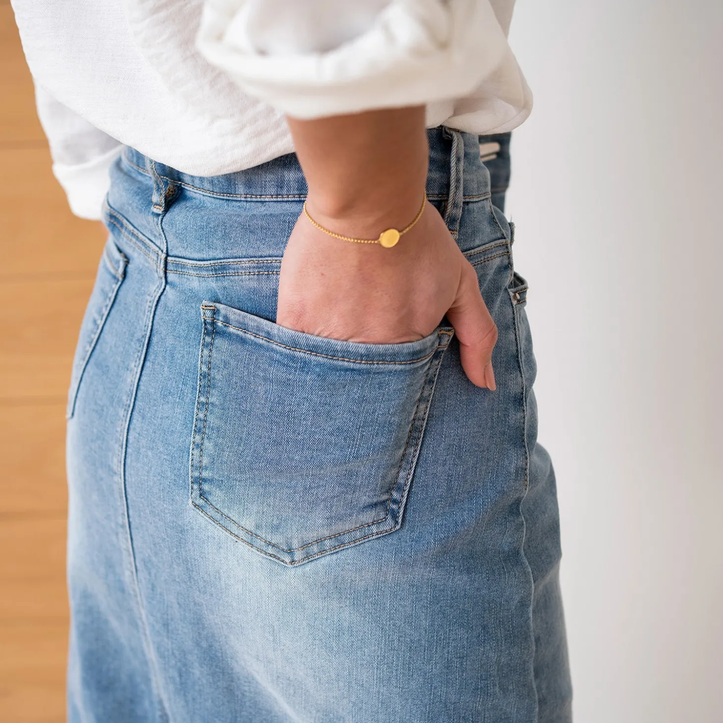 C’est LA pièce incontournable à avoir dans sa garde-robe cette saison. La jupe en jean bleu délavé opte pour une longueur midi, avec fente au milieu devant pour gagner en aisance. Les fashionistas la porteront avec un débardeur blanc, des chaussettes et une paire de sneakers.