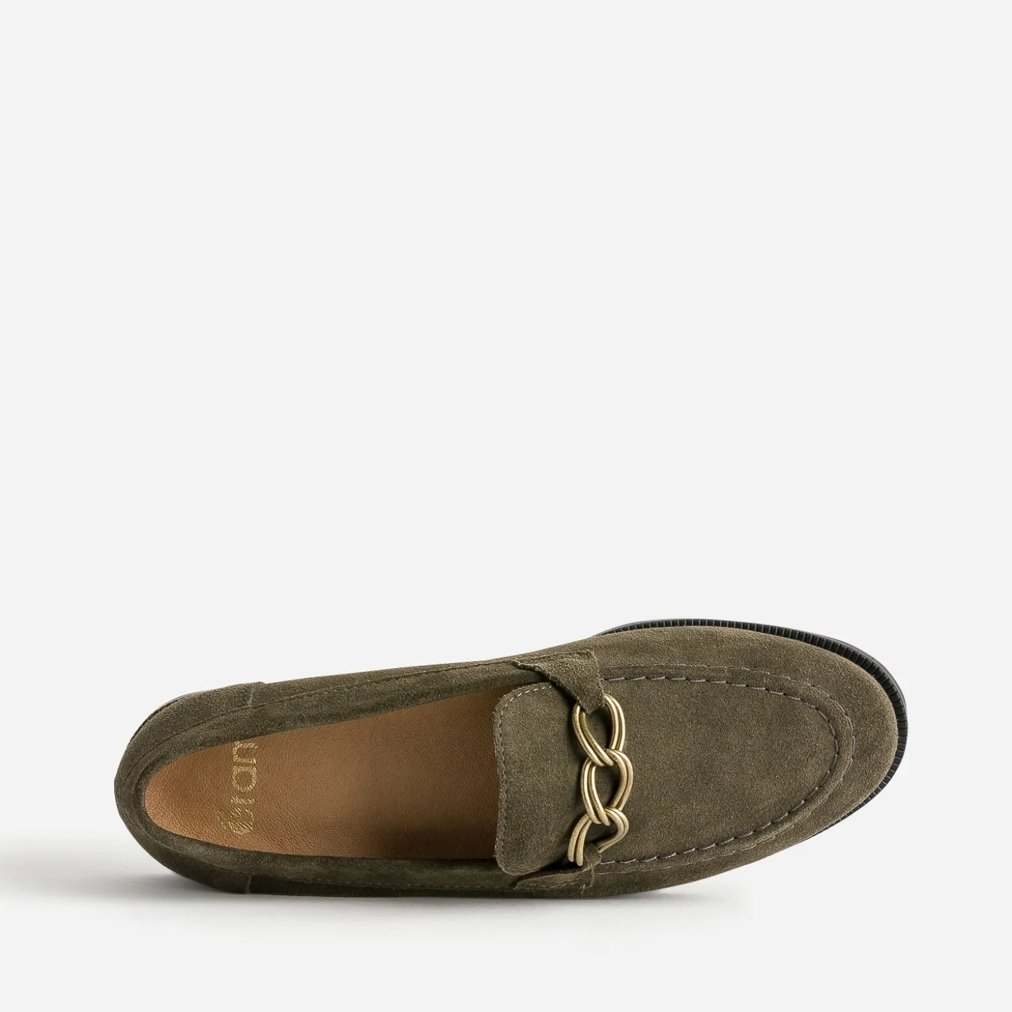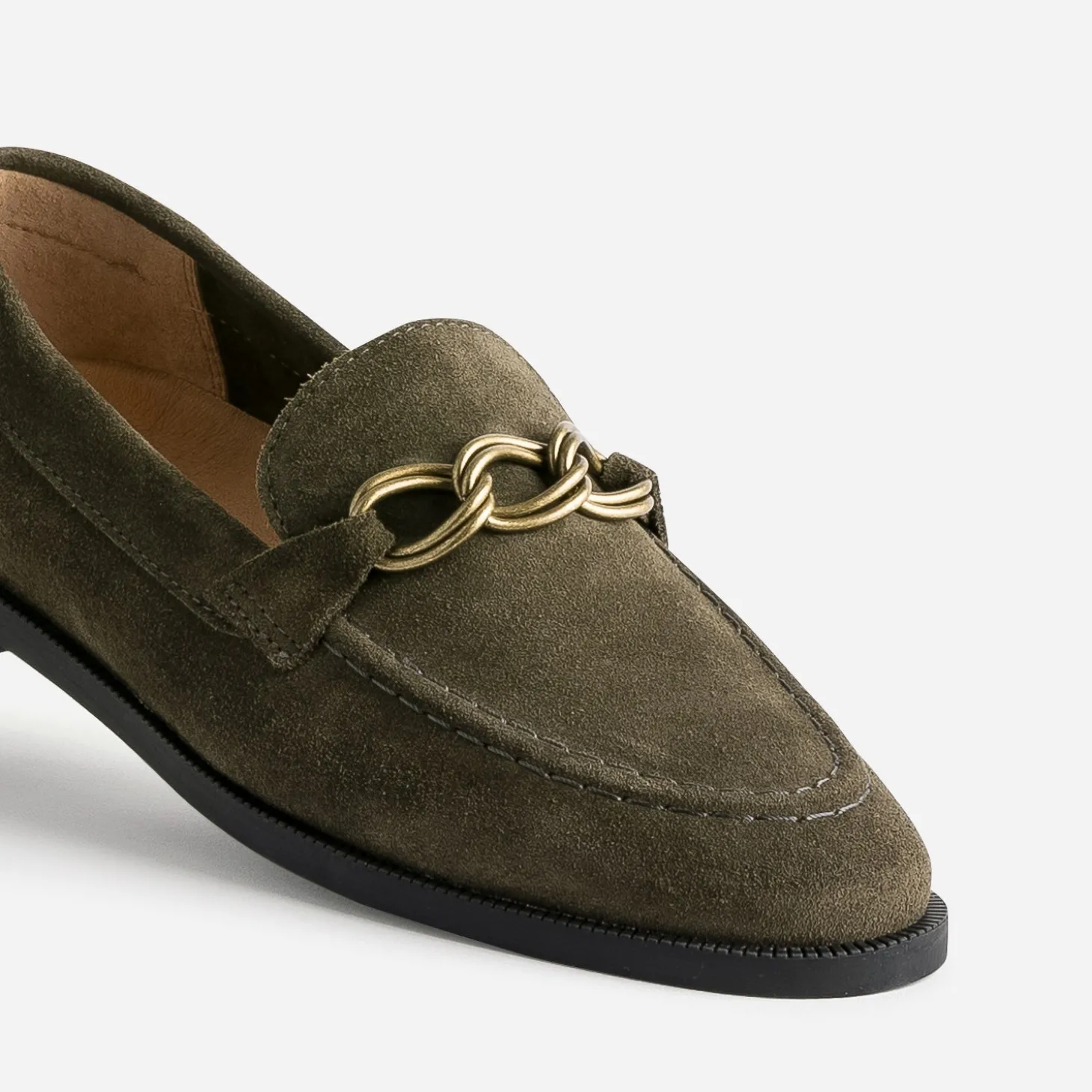Et si vous osiez une version colorée ? Le mocassin femme se décline en kaki, sublimé par un cuir velours. Sa ligne sobre est rehaussée d’un mors fantaisie, en métal jaune vieilli et tressé. Un modèle qui gagne en chic, avec une chemise blanche esprit liquette entièrement boutonnée, sur un pantalon droit vert sauge à revers fixes.