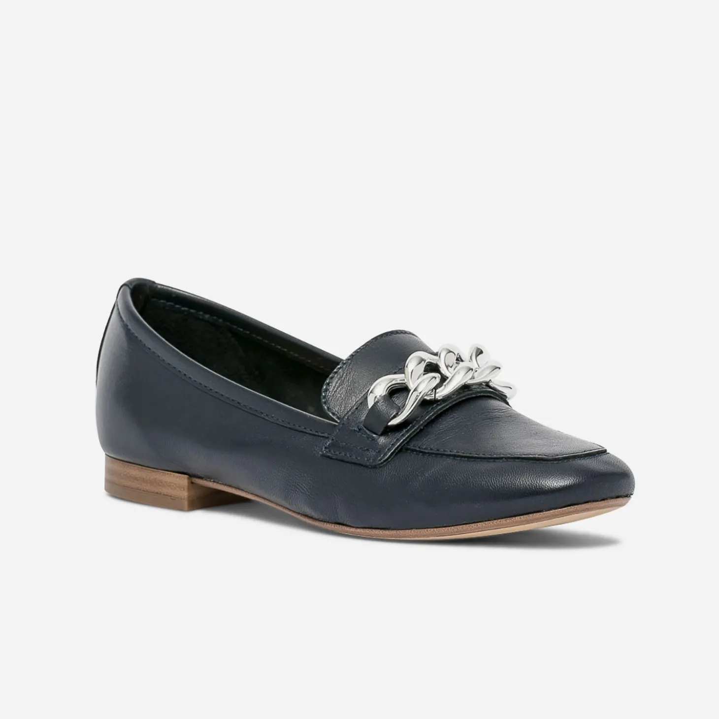 C’est une certitude : le mocassin pour femme est toujours à la pointe des tendance mode de la saison. En cuir lisse, il est non doublé, pour profiter d’une vraie souplesse, et se décline dans un sublime coloris bleu marine, sobre et intemporel. Sur le dessus, une maxi chaîne en métal argenté apporte une touche bcbg, à assumer avec une veste de costume bleu marine et un slim brut ou à décaler avec un look monochrome.