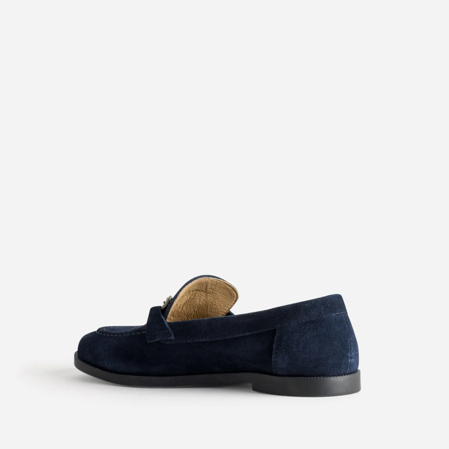 Et si vous osiez une version colorée ? Le mocassin femme se décline en bleu marine, sublimé par un cuir velours. Sa ligne sobre est rehaussée d’un mors fantaisie, en métal jaune vieilli et tressé. Un modèle qui gagne en chic, avec une chemise blanche esprit liquette entièrement boutonnée, sur un jean brut à revers fixes.