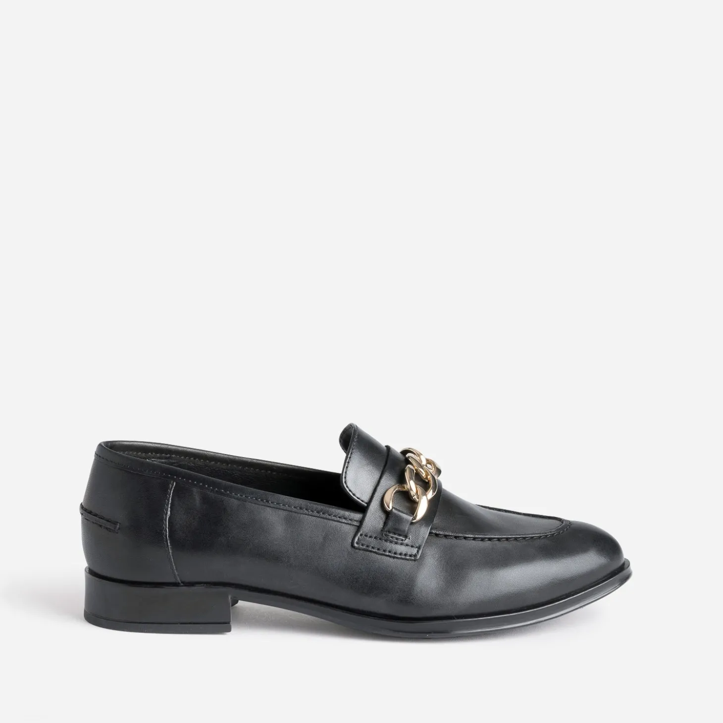 Toutes les modeuses en conviendront : le mocassin pour femme est toujours d’actualité. En cuir lisse noir, il présente une doublure bi matière en cuir et textile et une première en cuir. Le dessus du pied est décoré d’une grosse chaîne en métal doré. Un modèle à associer avec un pull gris à col V, un leggings en cuir et un manteau noirs, pour un look working girl moderne.