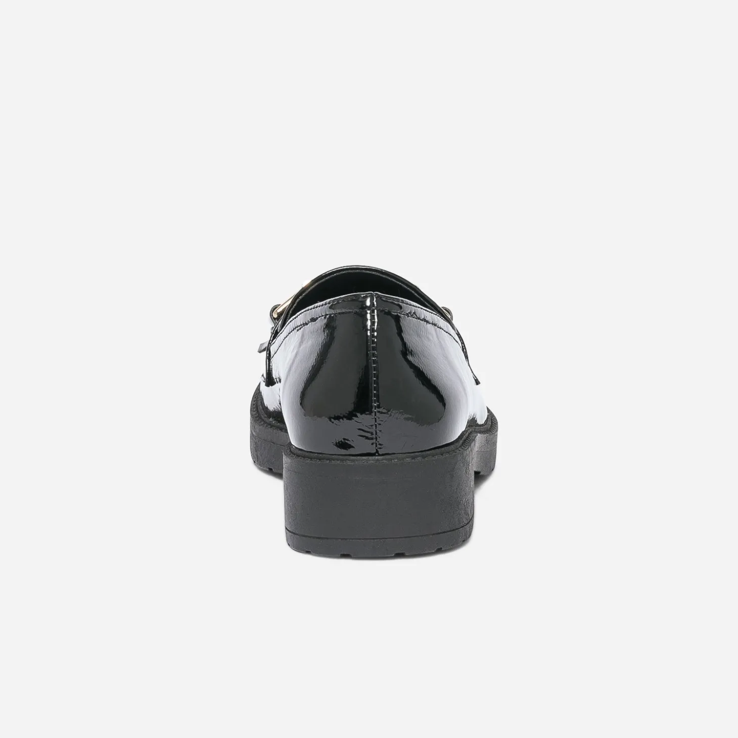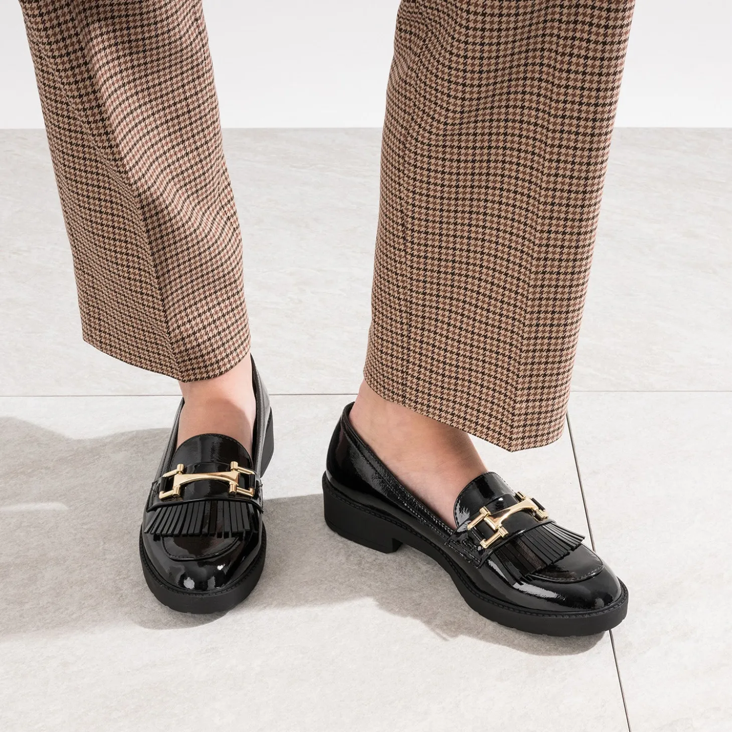 Exit le streetwear, retour aux fondamentaux de la mode. Le vestiaire d’écolière signe son grand retour, avec, aux pieds, le mocassin. En matière synthétique vernie noire, il est rehaussé d’un mors en métal doré et de franges ton sur ton. Veste de costume, jupe plissée, cravate, laissez-libre cours à votre imagination !