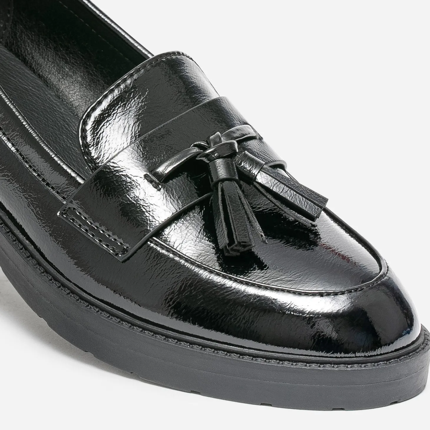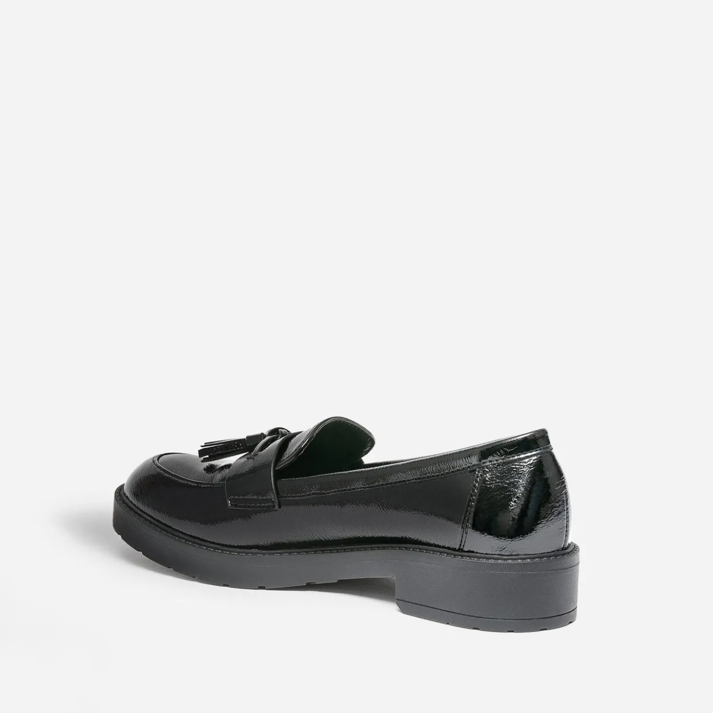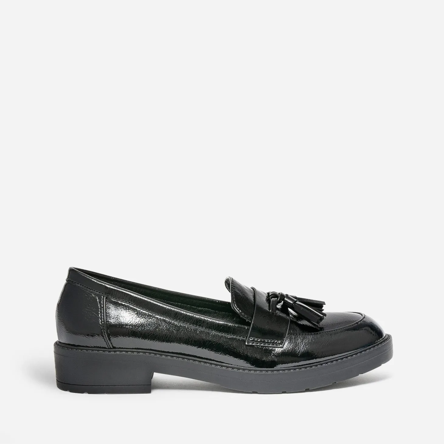 Dans la série des chaussures mi-saison, le mocassin tire son épingle du jeu. En matière synthétique noire, il se fait plus chic, grâce à sa finition vernie et ses deux pampilles sur le dessus du pied. Signature preppy par excellence, il se porte avec ou sans chaussettes, à choisir blanches et hauteur cheville, avec une robe ou une jupe courte et une veste de costume.