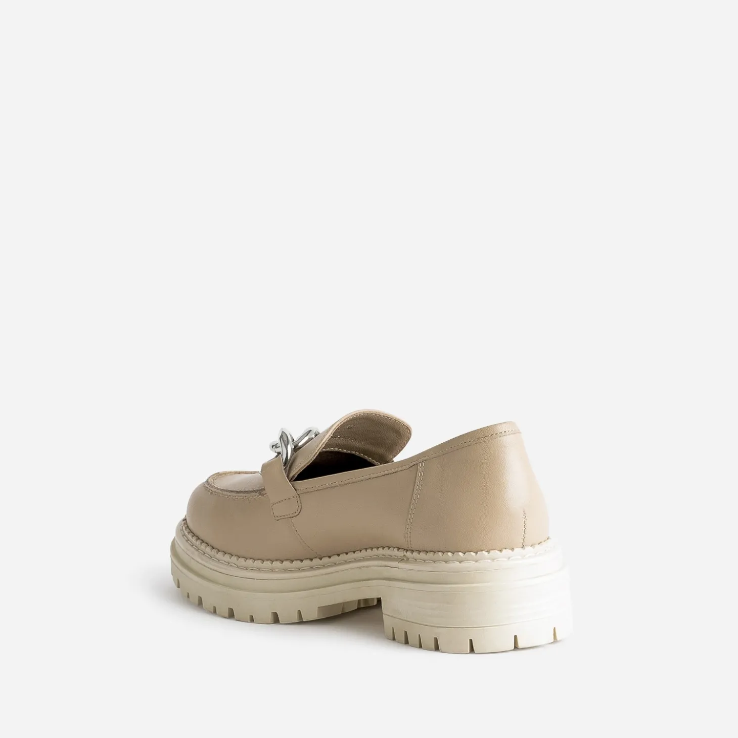 Faussement sage, la school girl 2.0 est dans le viseur mode de la saison. A son pied, le mocassin qui mène la danse. En cuir beige, il se modernise par une semelle crantée et une maxi chaîne en métal argenté sur le dessus du pied. Sortez votre chemise blanche, ajoutez-lui une cravate, associez-la à une jupe ou un pantalon à pinces, avec un blazer.