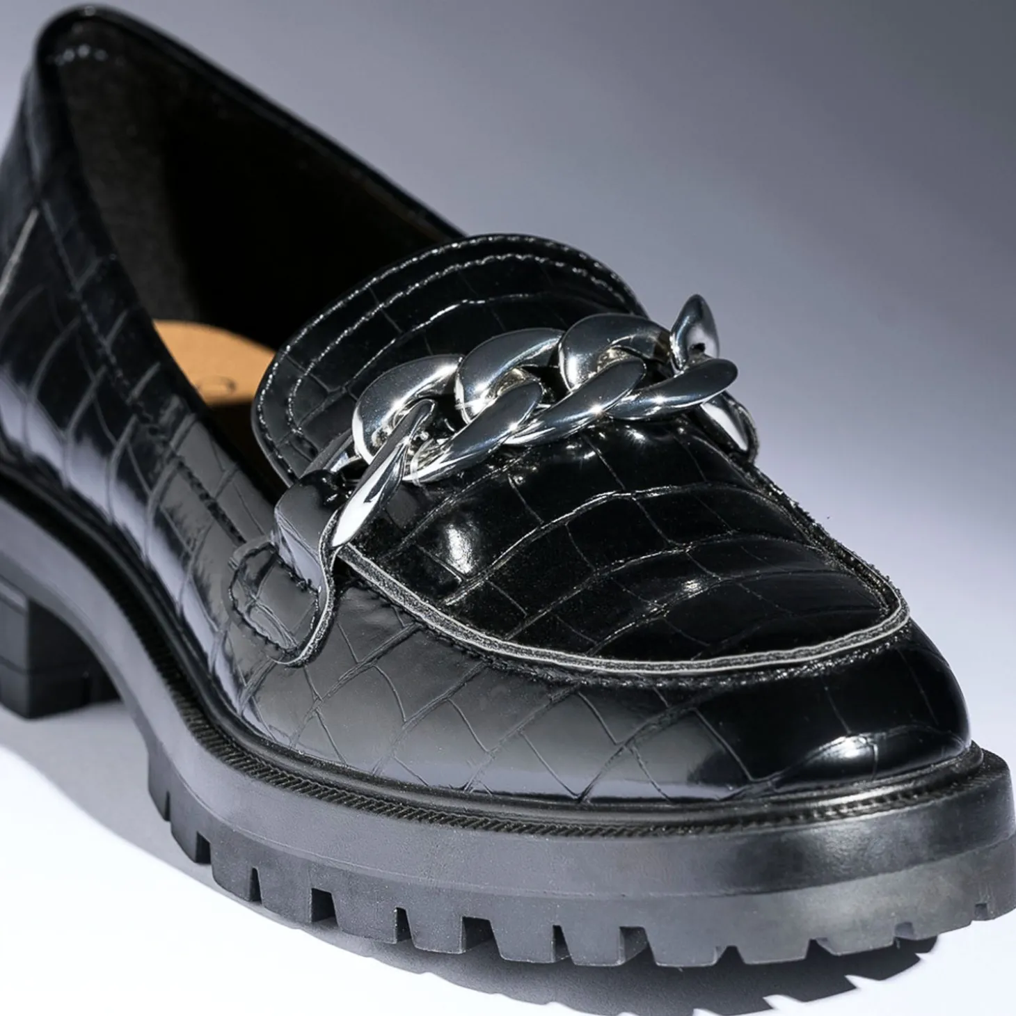 Oubliez tout ce que vous saviez sur le mocassin femme. Cette saison, il impose, on ose ! Semelle crantée, talon large, embossage effet croco et grosse chaîne en métal blanc, il conserve un coloris noir qui matche avec tout. Un modèle à essayer avec une jupe longue et plissée ou avec une tenue qui mixe avec soin les imprimés.