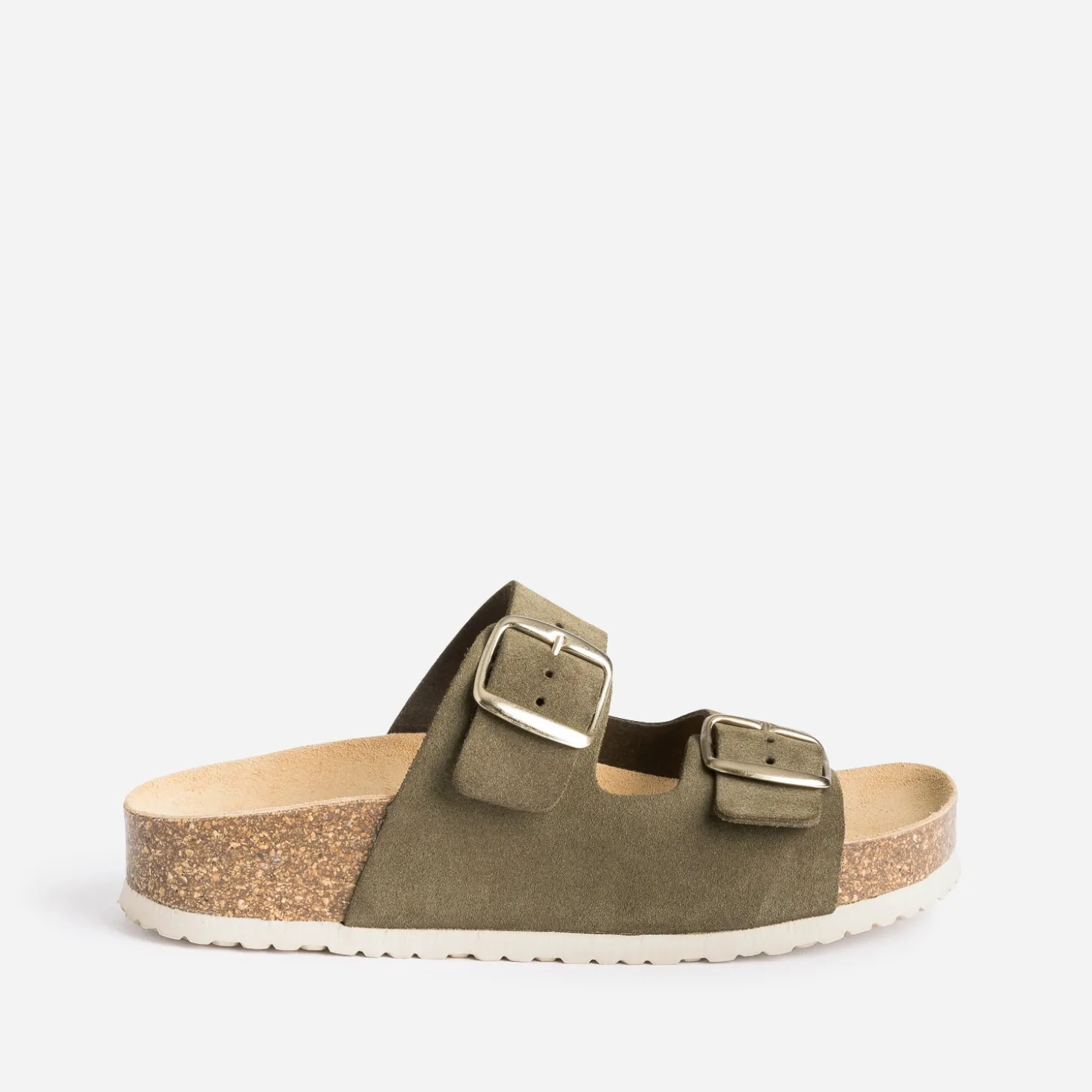 Parce qu’elle s’enfile en un clin d’œil. Parce qu’elle est ultra tendance. Parce qu’elle défend un confort incomparable. 3 bonnes raisons de craquer pour cette mule anatomique pour femme. Les deux larges brides en cuir velours s’autorisent un coloris kaki très tendance et se ferment par des maxi boucles. Son atout mode ? Une semelle plateforme avec première en cuir velours beige. Un modèle que vous n’allez plus quitter de l’été !