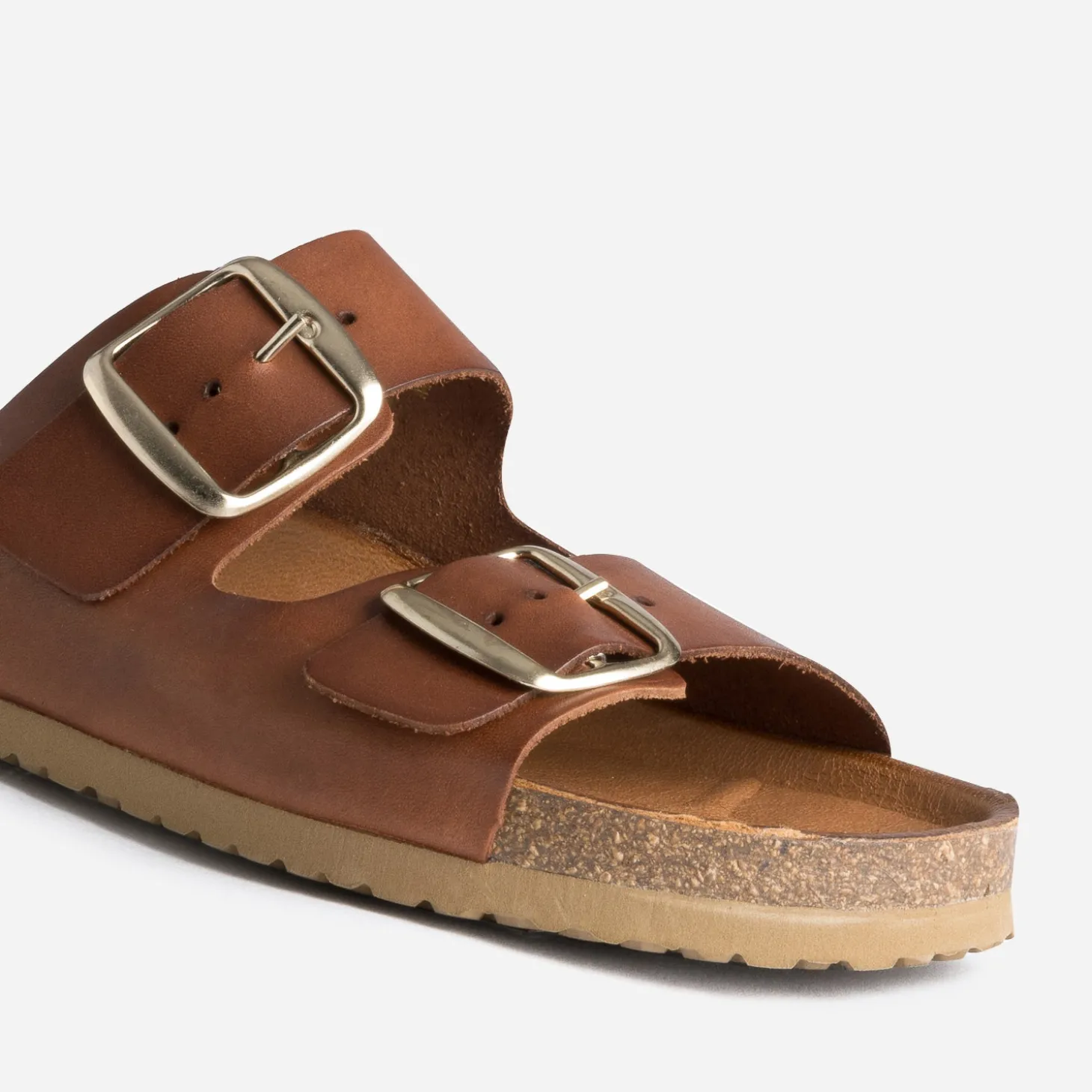 Tige en cuir sur première en cuir, la mule anatomique est un essentiel du shoesing estival. Elle se décline en coloris camel, élégant et intemporel. Les deux larges brides peuvent s’ajuster au pied, par des boucles en métal doré. Un modèle à réserver avec un look décontracté, marinière et pantalon chino.