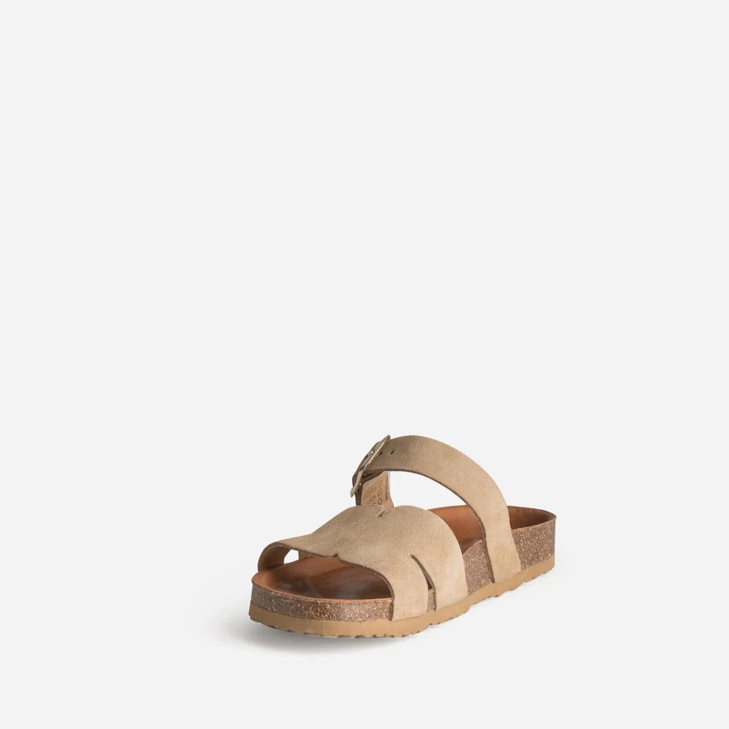 Laissez-vous séduire par cette mule plate pour femme à la ligne épurée. Montée sur une semelle anatomique très confortable, et confectionnée en cuir velours souple, elle maintient le pied par une large bride et une fine bride ajustable par boucle, déclinées en coloris beige. Un modèle à l’allure décontractée, à essayer avec un tailleur-bermuda en lin naturel.