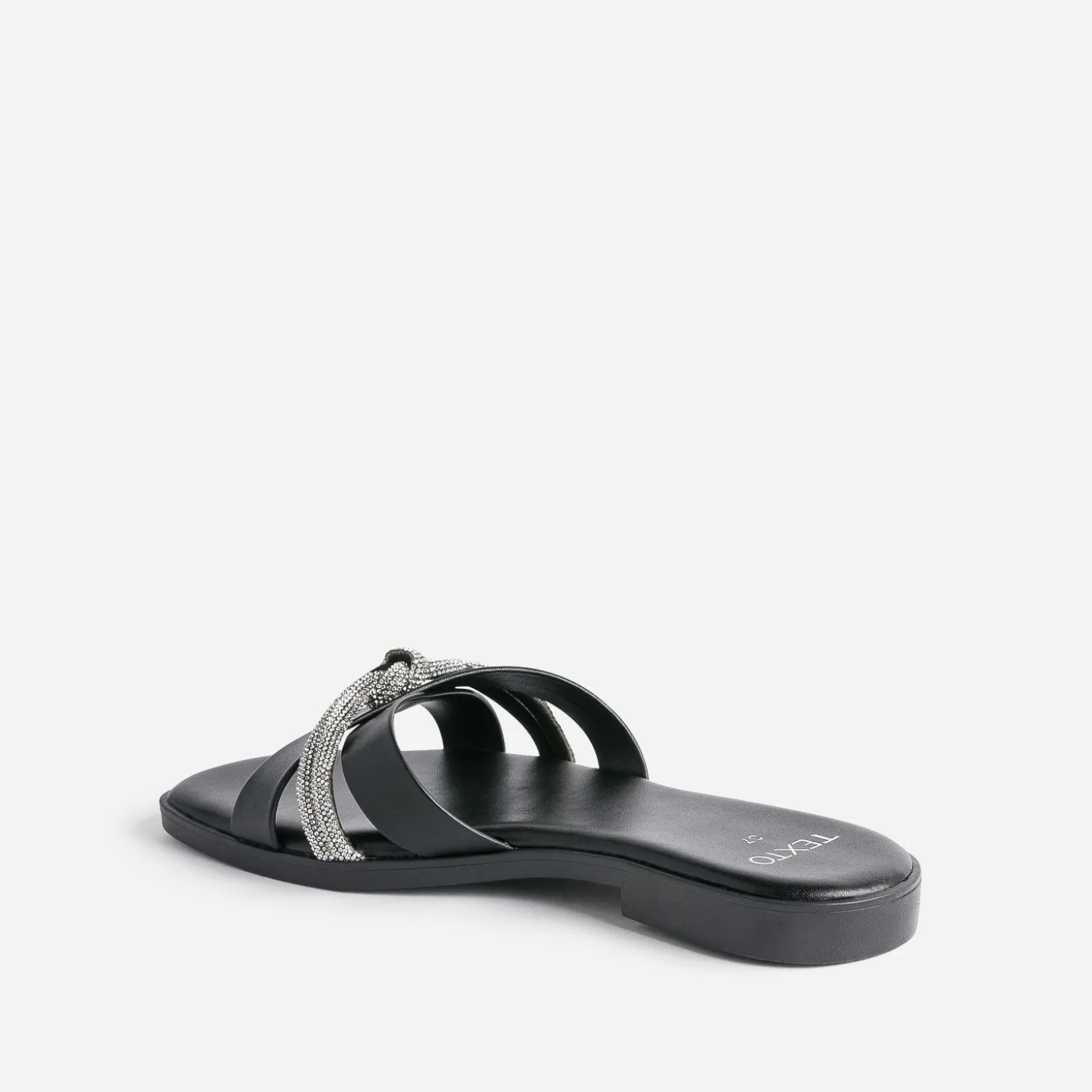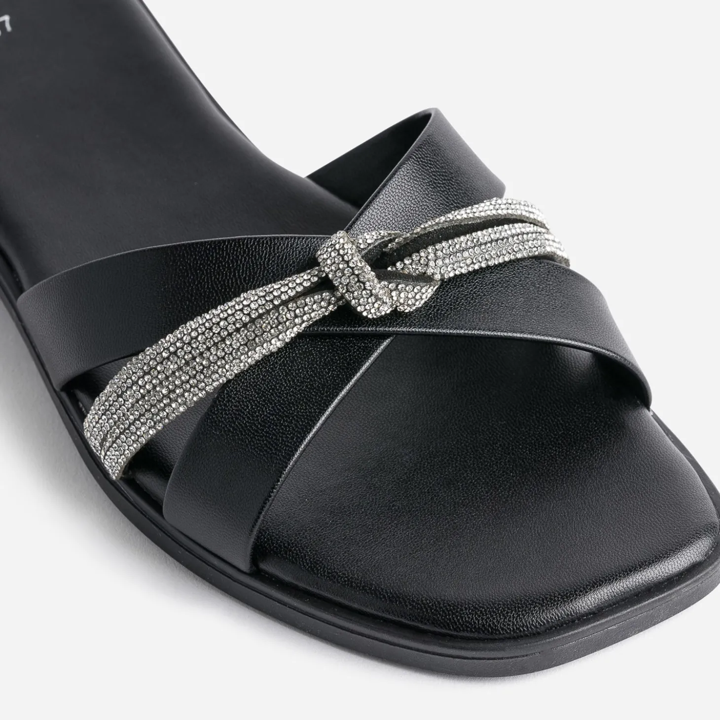 Bout carré et talon plat, cette mule femme gagne en chic par une seule et unique bride strassée, nouée sur le dessus du pied. Une bride qui complète les deux brides croisées en matière synthétique noire. Un modèle à privilégier avec une tenue élégante, petite robe noire ou top sur pantalon large, tout en fluidité.