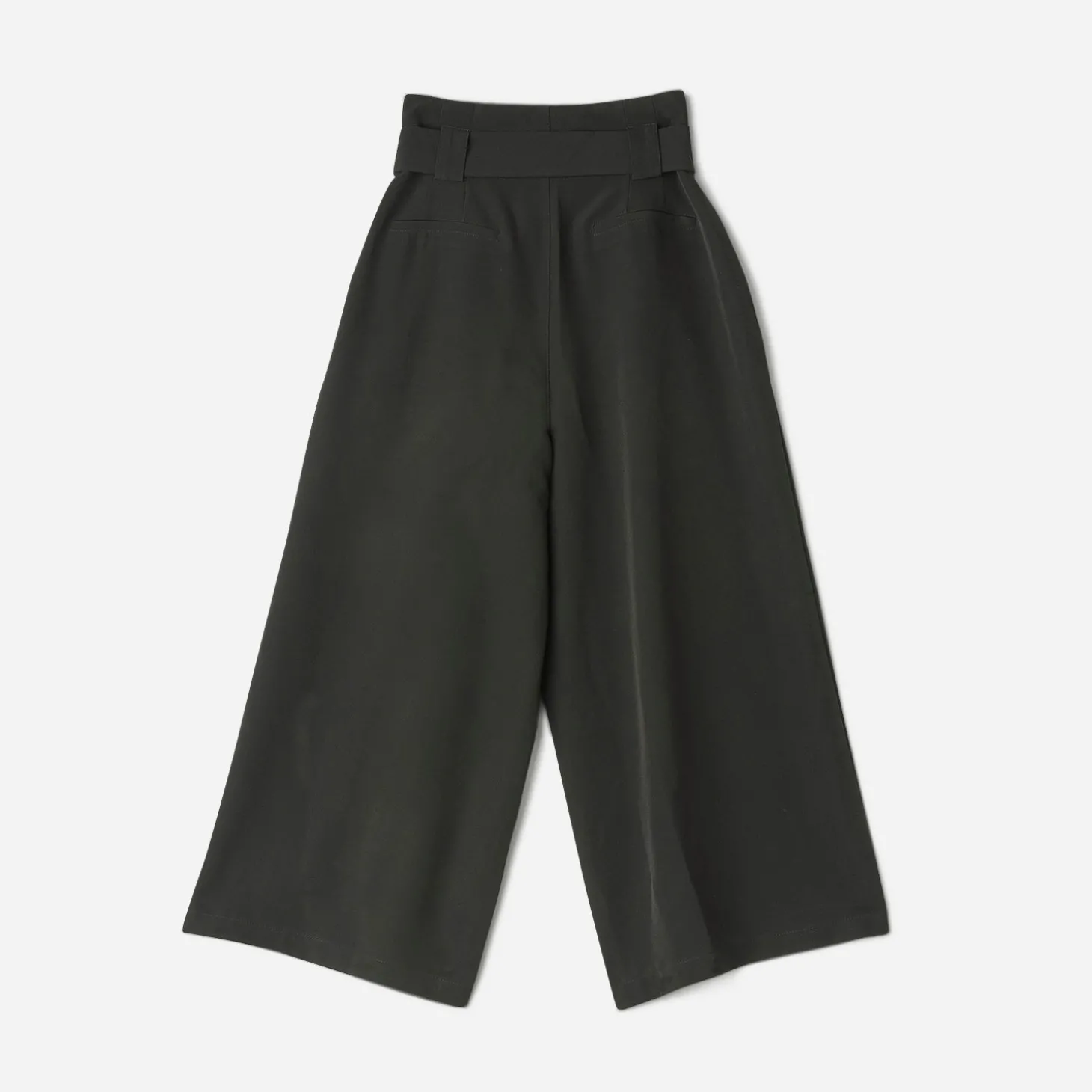 Volume large, longueur cropped, taille haute, 2 poches passepoilées côtés, jeux de plis à la taille, ceinture amovible, fermeture par zip et crochet.