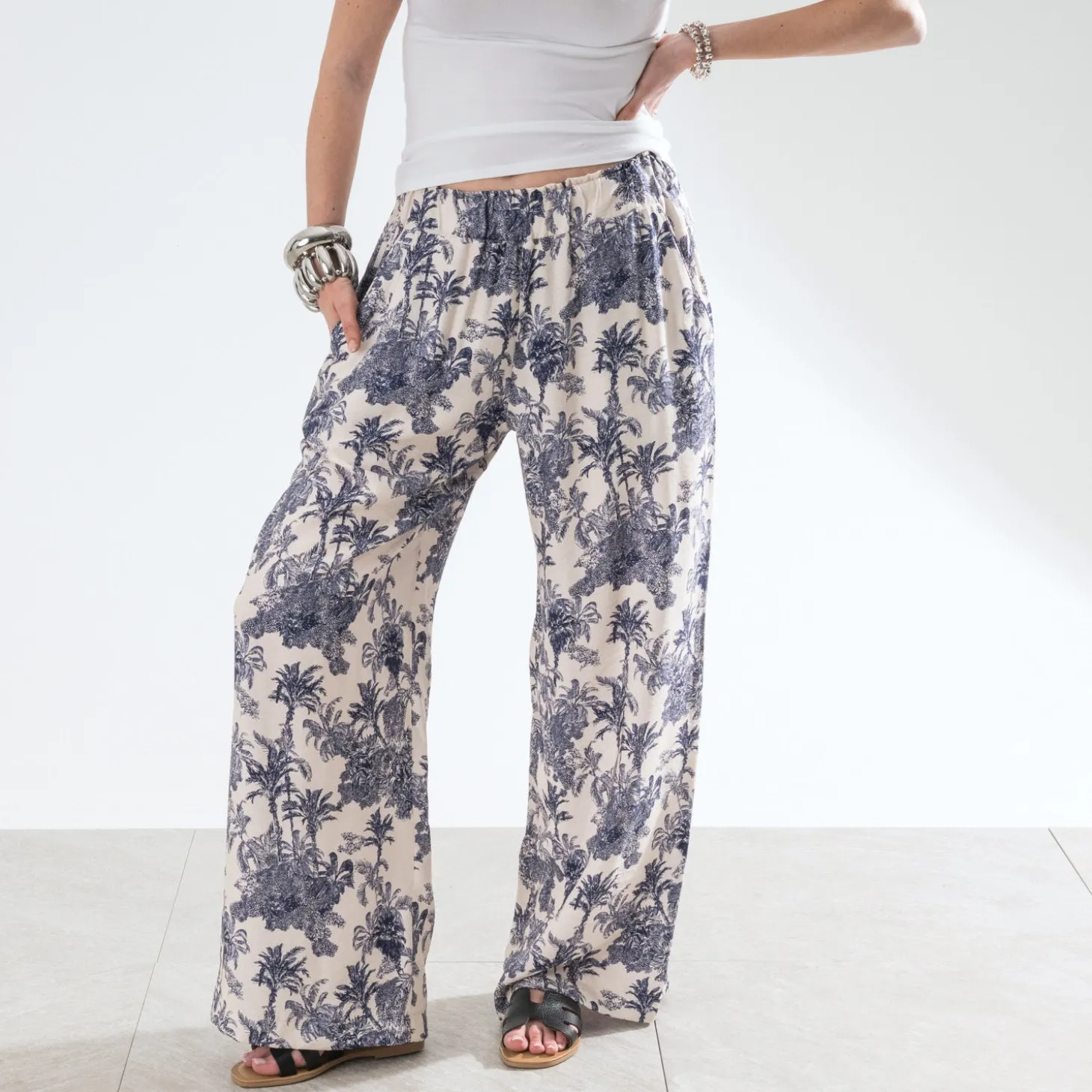 Impossible de faire l’impasse sur le pantalon large, must-have de l’été. En textile fluide, il s’anime d’un imprimé palmiers façon toile de Jouy bleu sur fond écru.Ses alliés ? Un débardeur blanc côtelé, une veste en jean et des mules plates.