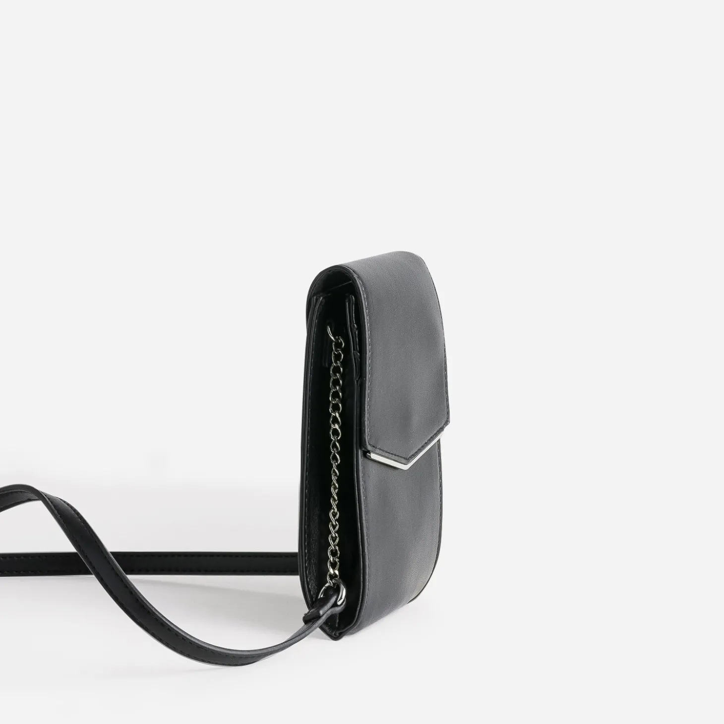 Gardez votre téléphone et quelques cartes toujours à portée de main, c’est l’idée de cette pochette à placer autour du cou, sur l’épaule ou croisée, grâce à sa bandoulière bi matière. En matière synthétique noir, elle gagne en style, par sa barrette métal en V, placée sur le bord du rabat.