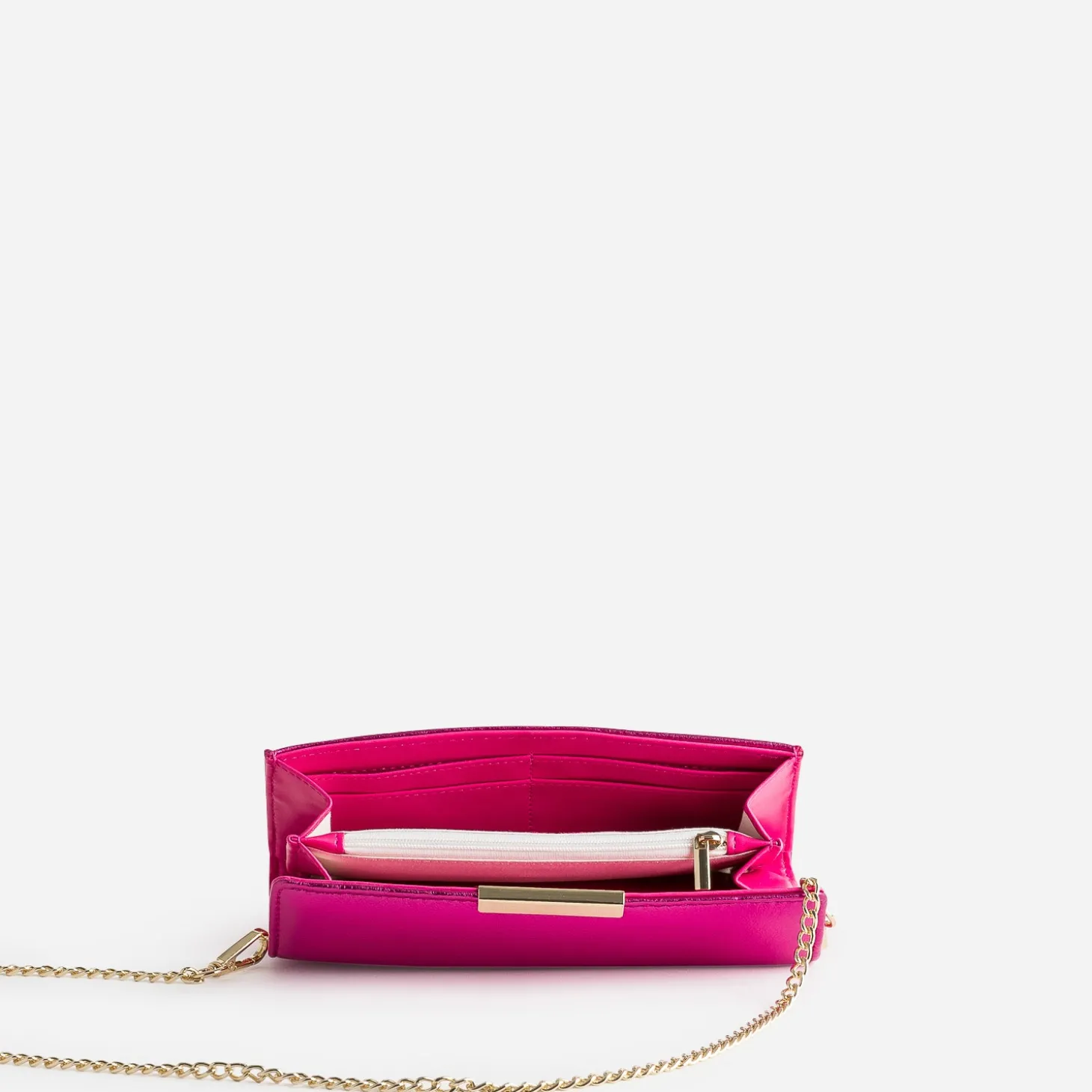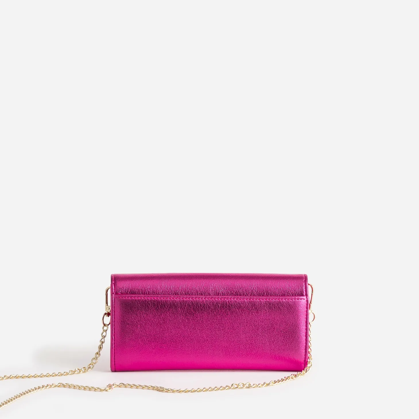 Mini format validé pour cette pochette rose vif. Sa matière synthétique lisse avec finition métallisée, est proposée sur un support rigide fermé par aimant. La bandoulière-chaînette en métal doré est amovible, proposant un porté main, sur l’épaule ou croisé. Un accessoire à adopter, pour vous alléger en soirée.