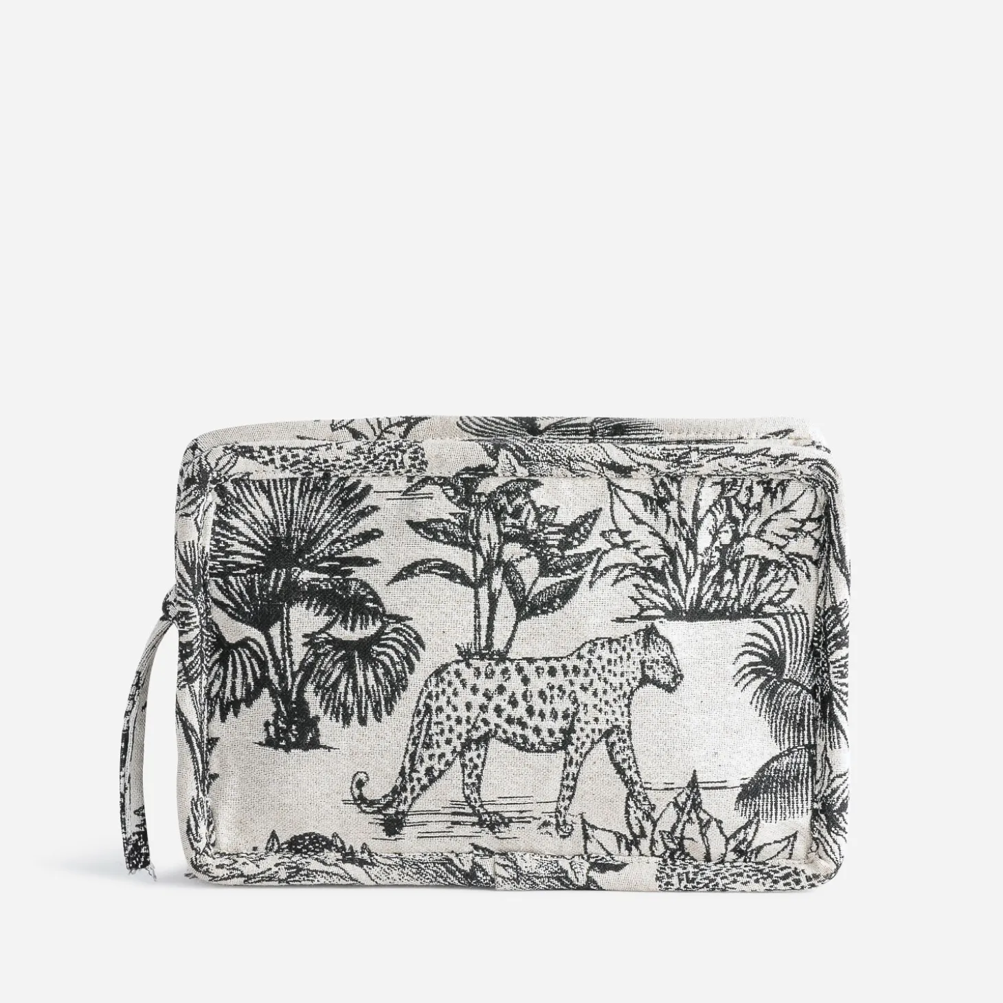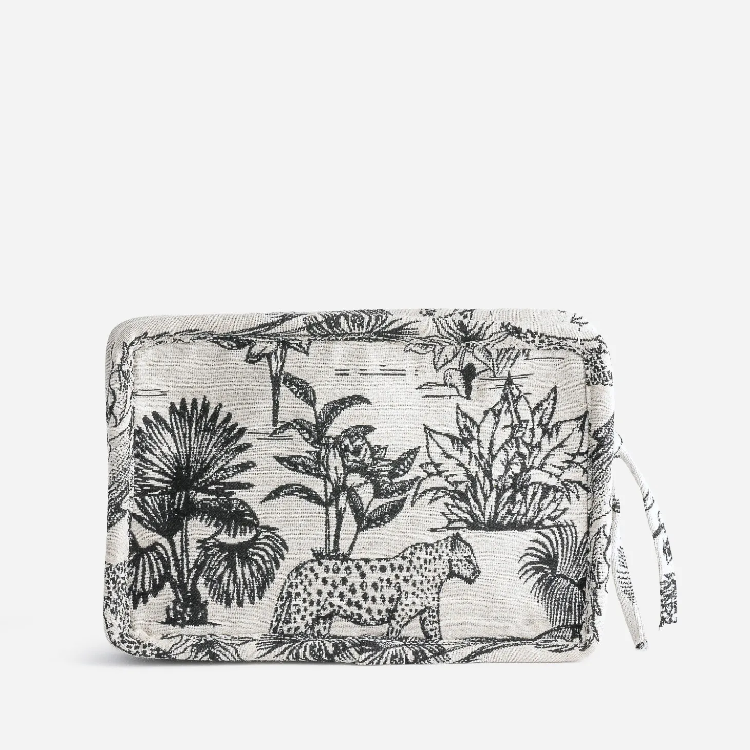 Cette pochette est conçue pour accueillir papiers, make up ou tout autre chose indispensable, à garder à portée de main. En tissu jacquard beige et noir, elle met à l’honneur un motif jungle, invitant léopards, perroquets et végétaux. Un modèle à garder à la main en soirée, ou à glisser dans un sac.