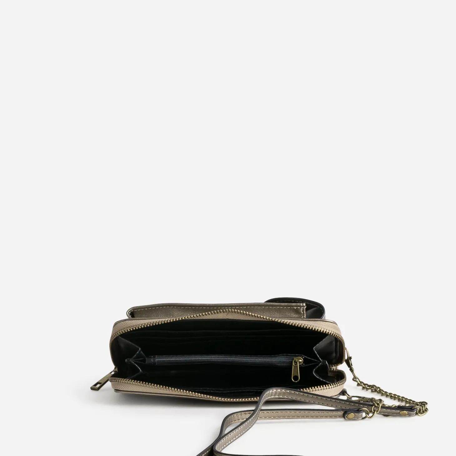 Cartes, billets, monnaie, papiers, dans la partie portefeuille. Téléphone portable, dans la poche externe avec rabat aimanté. Voilà un accessoire qui compile les deux, pour garder vos essentiels à portée de main, grâce à sa bandoulière-chaînette dorée réglable et amovible. Confectionné en matière synthétique taupe, il s’autorise une finition métallisée, pour twister les looks d’une touche chic.