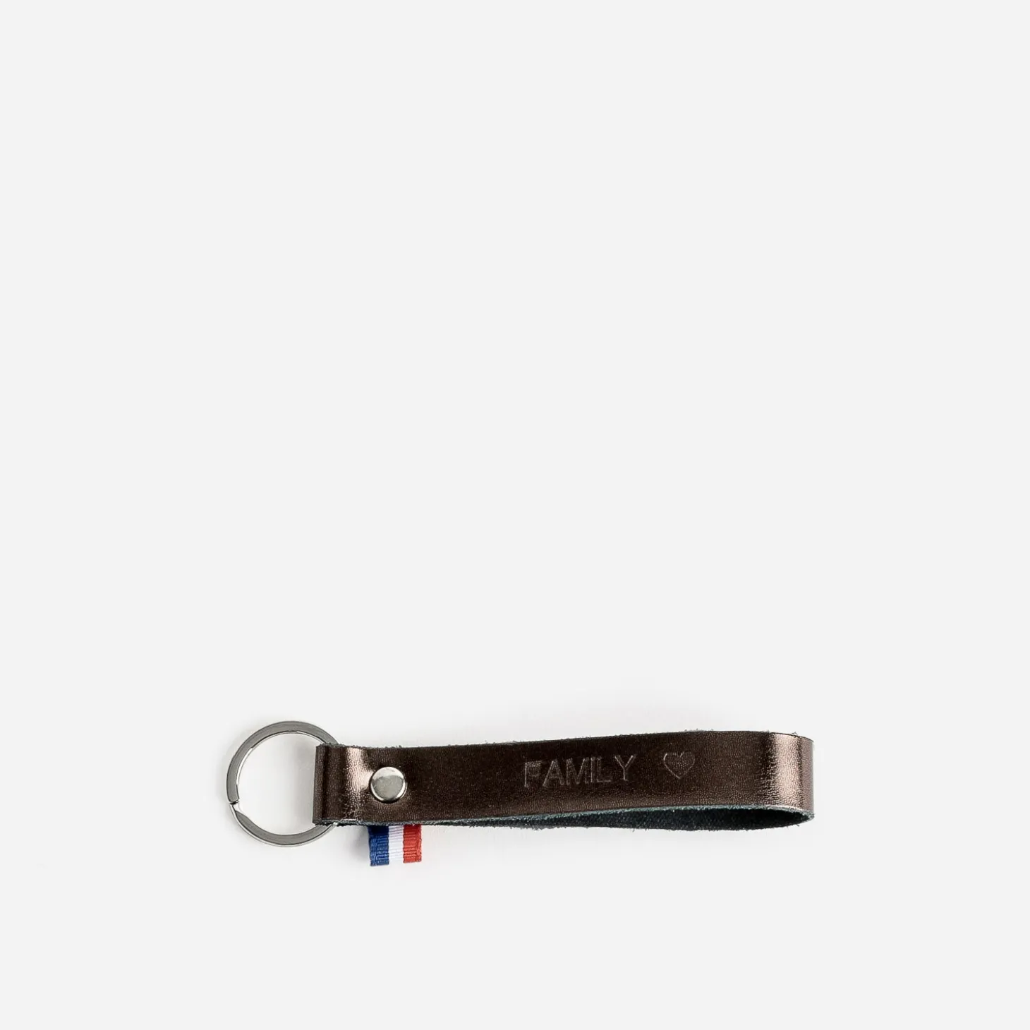 Il y a les clés de la maison, celles du bureau et de la voiture, les clés des champs ou celles de votre cœur… A vous de décider ! Très simple, constitué d’une logue boucle en cuir bronze, ce porte-clé marque sa singularité par une finition métallisée et une sérigraphie Family, accompagnée d’un cœur. Un modèle à offrir à vos parents, votre conjoint, ou n’importe quelle personne de votre entourage proche !