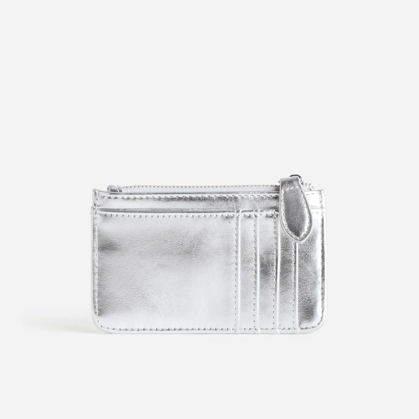 Un peu de monnaie, quelques cartes. Ce porte-monnaie accueille tout ça, malgré son petit format, facile à glisser dans une poche. Il est conçu dans une matière synthétique métallisée de couleur argentée, que vous aurez plaisir à montrer.