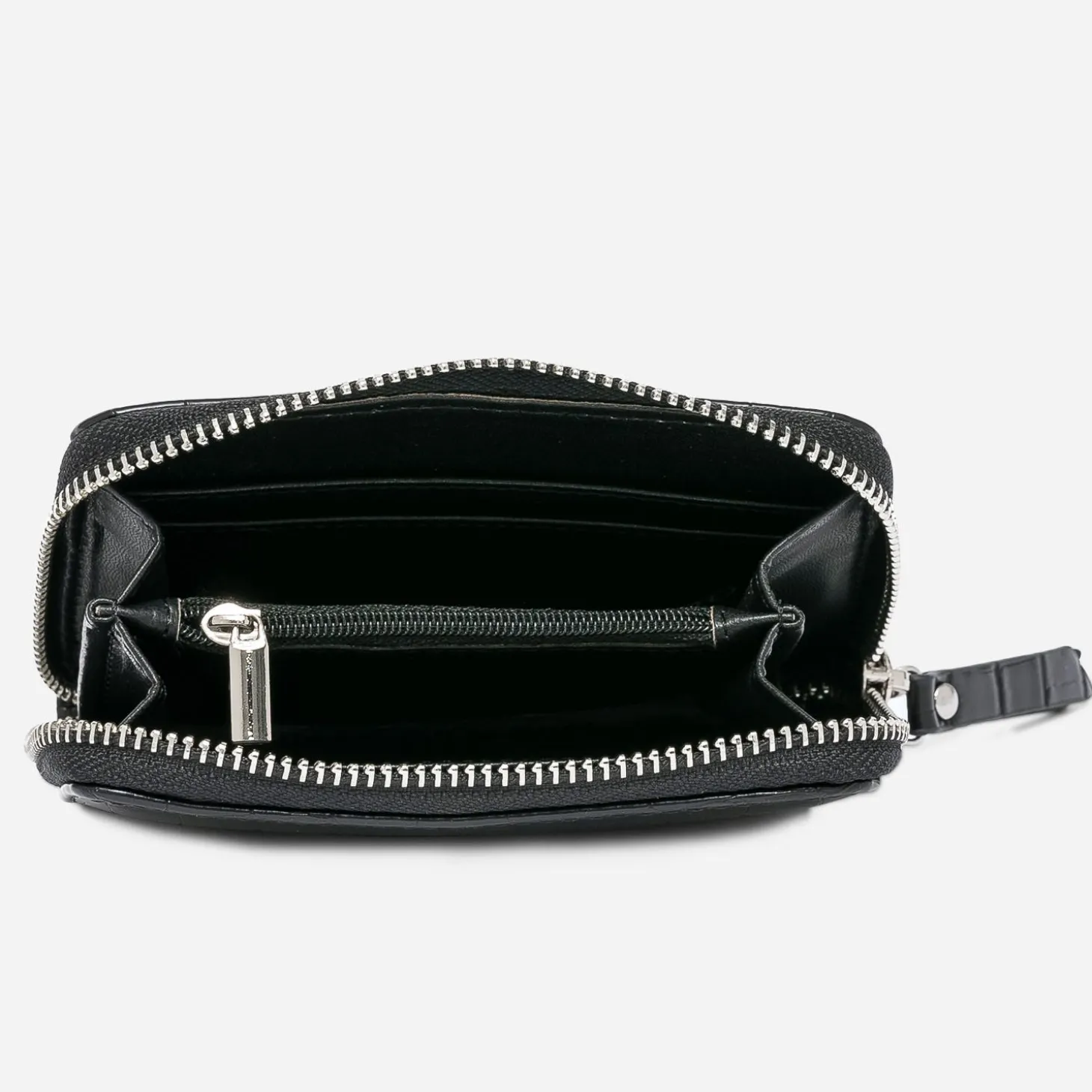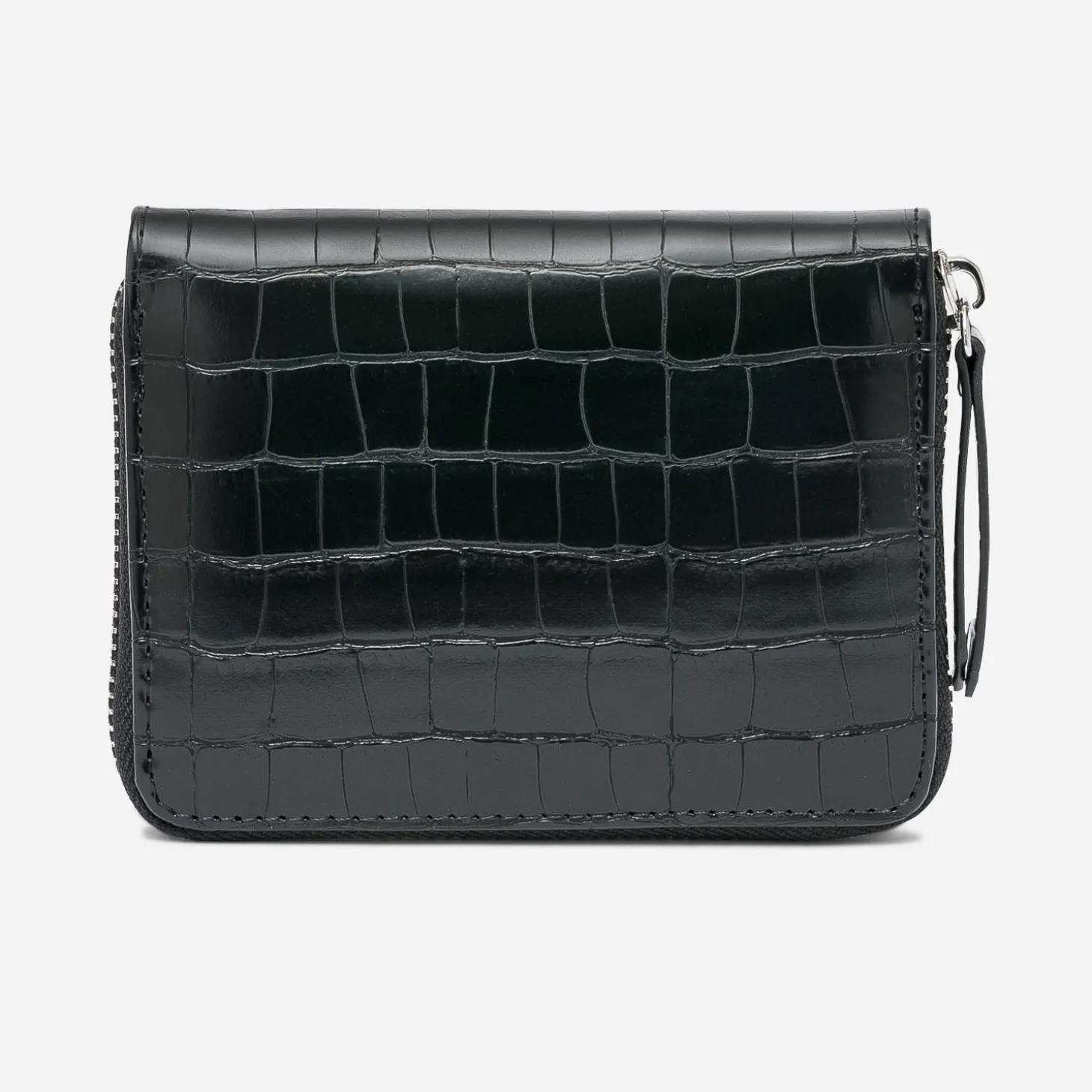 Rock et chic à la fois, ce portefeuille prône le petit format. En matière synthétique noire, il se démarque par un embossage effet croco. A l’intérieur, 1 poche zippée peut accueillir la monnaie, et 4 fentes, les cartes. Un modèle que vous serez fière de sortir, dès la prochaine sortie !