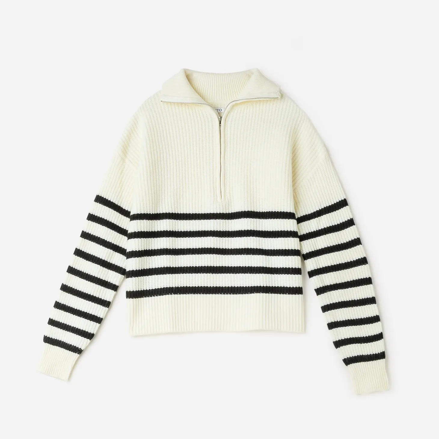 Coupe oversize, col camionneur, manches longues, motif rayures esprit marinière, bords-côtes au col, manches et buste, fermeture par zip au col.