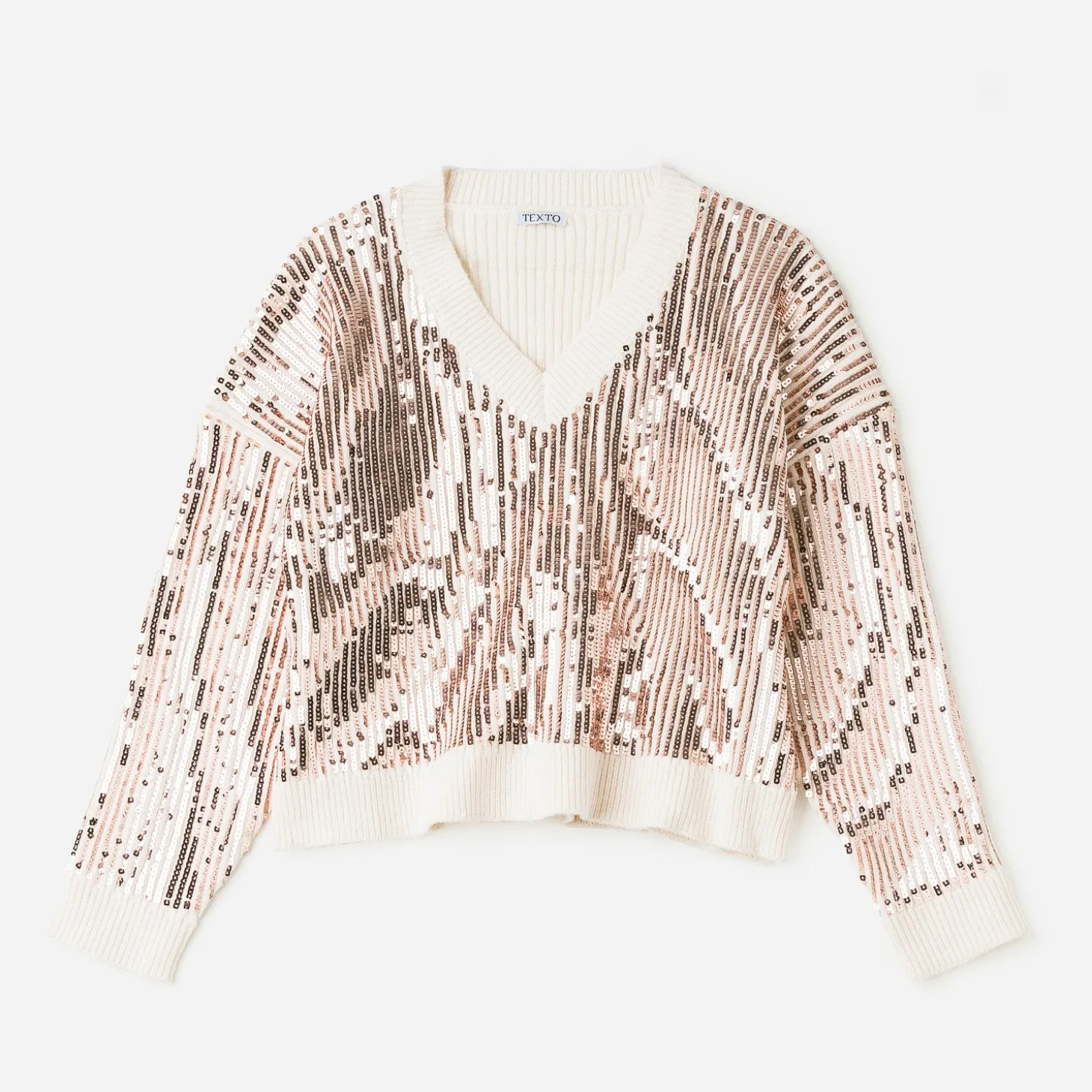 Coupe droite, encolure V, manches longues, broderies sequins rose cuivré, bords-côtes 1×1 au col, manches et buste.