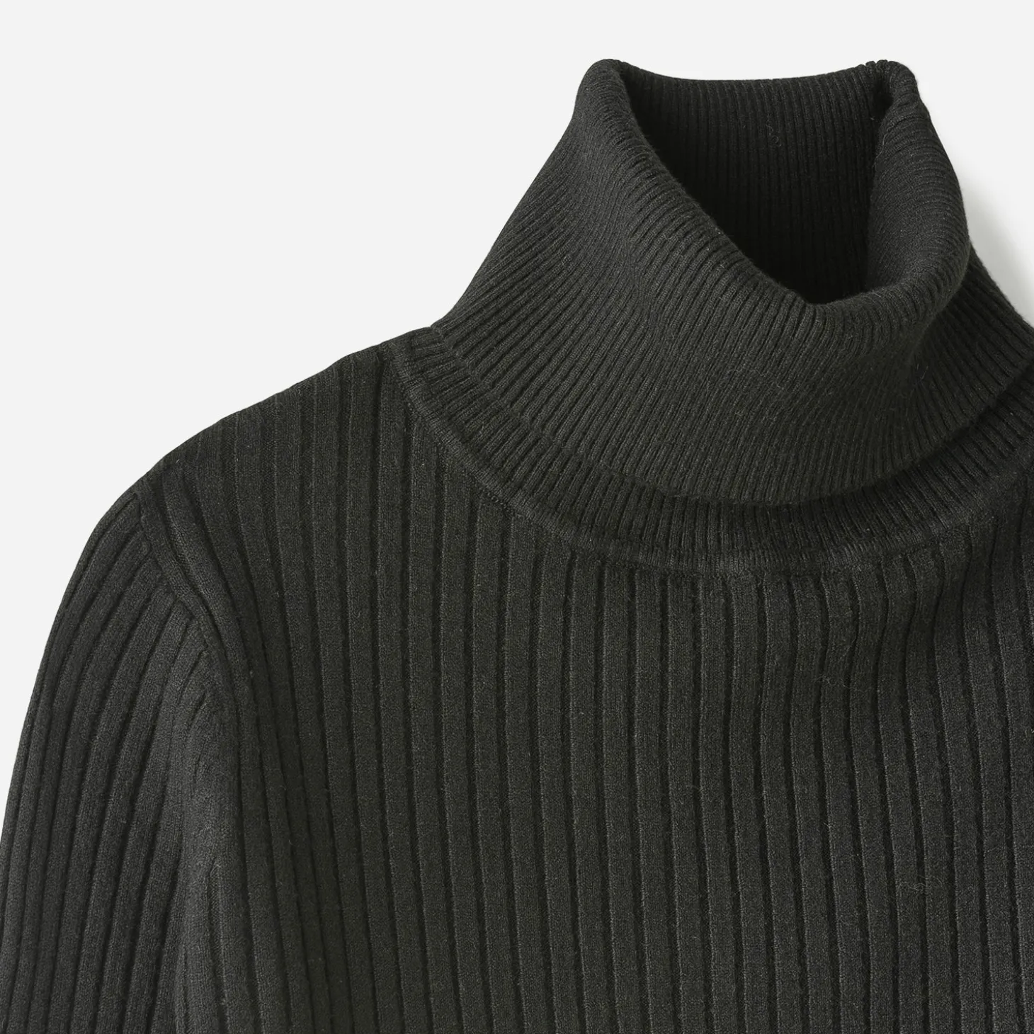 Coupe droite, col roulé, manches longues, bord-côte 1×1 au col