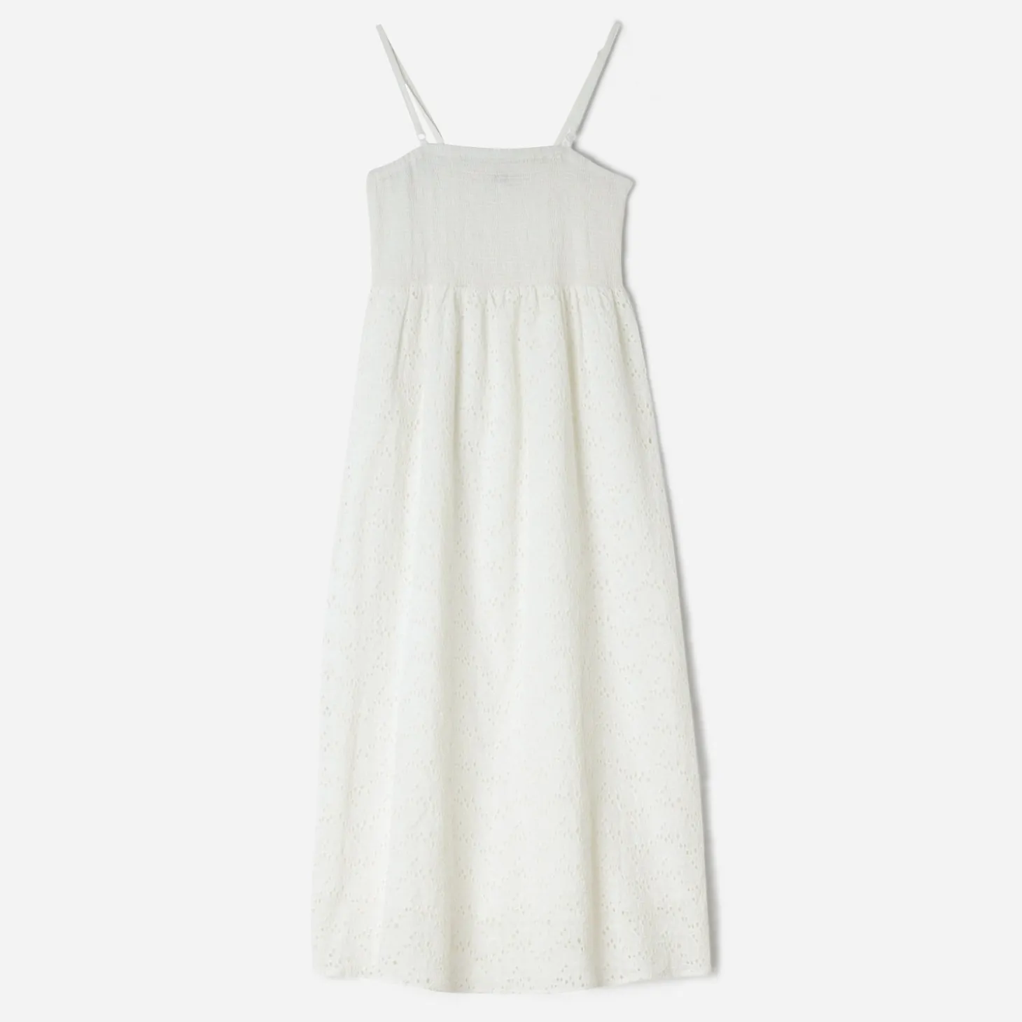 Forme droite, col droit, fines bretelles ajustables, smocks sur le bustier, découpe taille, taille élastiquée, broderie anglaise, doublure unie, longueur de la robe : 132 cm pour une taille S