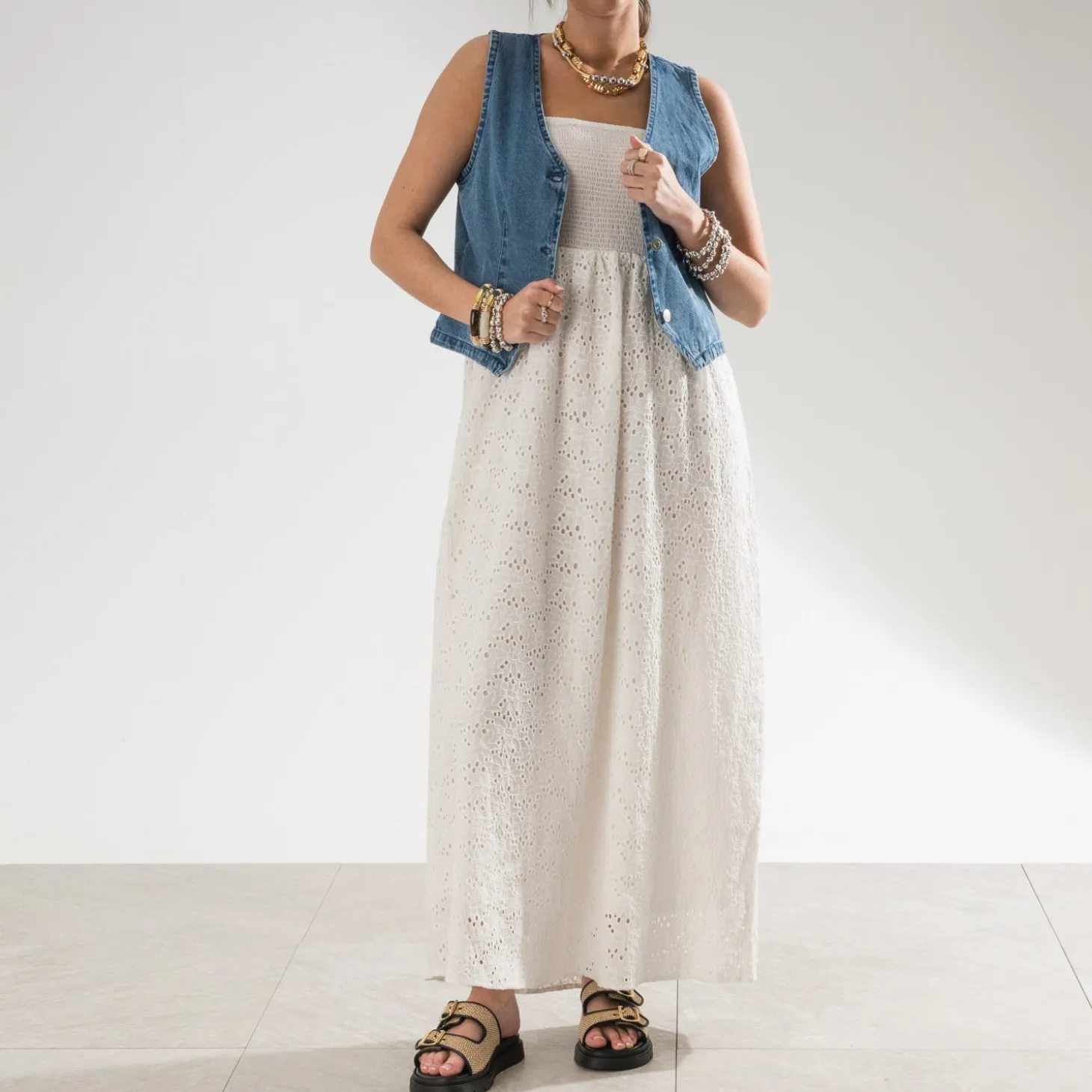 Les soirées d’été et leurs tenues légères : tout un programme. Optez pour la robe longue écrue en broderie anglaise. Le bustier entièrement smocké et à fines bretelles met en valeur le buste et la peau hâlée. Un modèle à accessoiriser de bijoux et de sandales plates dorées.