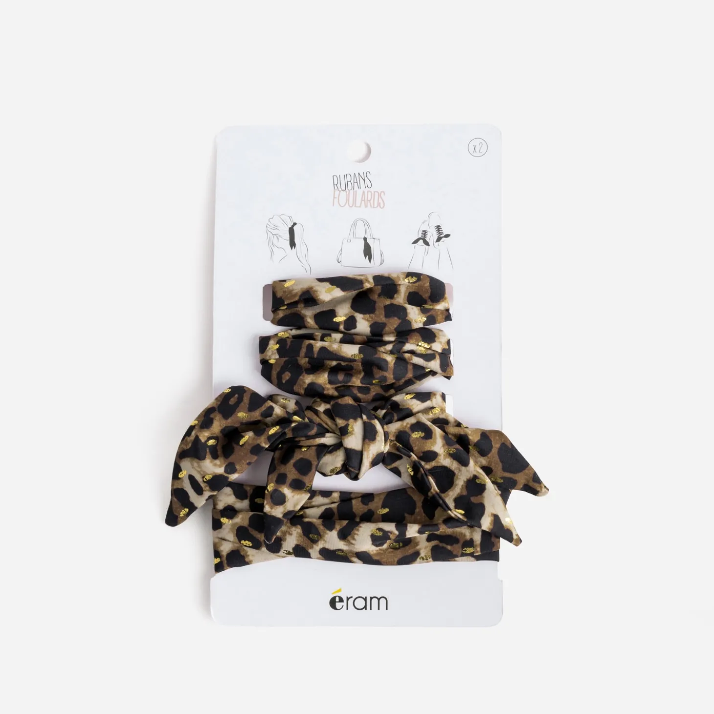 Pour cacher l’élastique dans les cheveux. Pour twister l’anse d’un sac à main. Pour revisiter vos sneakers préférées. Faites le test des rubans-foulards, sans attendre. Vendus par paire, ils se décline en coloris beige, rythmé d’un imprimé effet léopard, avec des touches de doré. Un nouvel accessoire, parfait pour customiser les looks d’une touche mode maîtrisée.