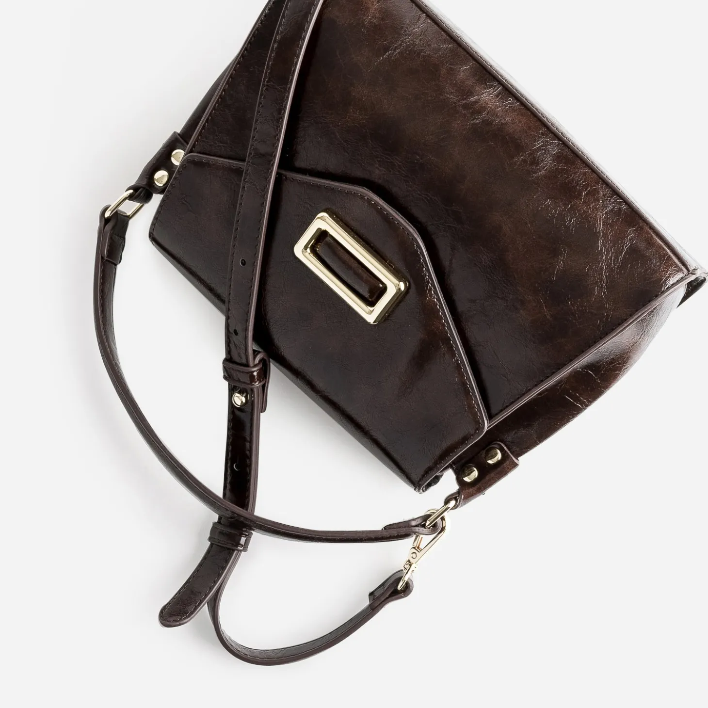 Une courte anse pour un porté à la main ou sur l’avant bras. Une bandoulière réglable et amovible, pour un porté sur l’épaule ou croisé. Ce sac à main séduit d’abord par sa fonctionnalité. Il n’en délaisse pas pour autant le style, signé par sa forme trapèze fantaisie, sa matière synthétique rigide et son coloris marron foncé avec effet patiné. Un accessoire esprit rétro, qui apporte du chic, à toutes les tenues.