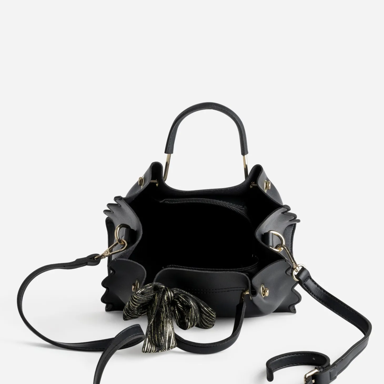 Il revient ! Décliné en coloris noir sur une matière synthétique lisse, ce sac à main se démarque par des bords à finition vague, deux anses rigides et un ruban à imprimé rayures dorées sur fond noir irisé. Livré avec une bandoulière réglable et amovible, il se porte sur l’épaule ou croisé, de préférence avec un look sophistiqué.