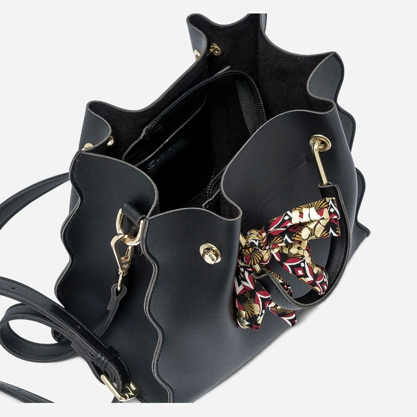 Il revient cet été ! Décliné en coloris noir en matière synthétique lisse, ce sac à main se démarque par des bords à finition vague, deux anses rigides et un fin ruban à impriméArt Déco dans les tons noir, rouge et blanc, rehaussé de touches d’or. Livré avec une bandoulière réglable et amovible, il se porte sur l’épaule ou croisé, de préférence avec un look sophistiqué.