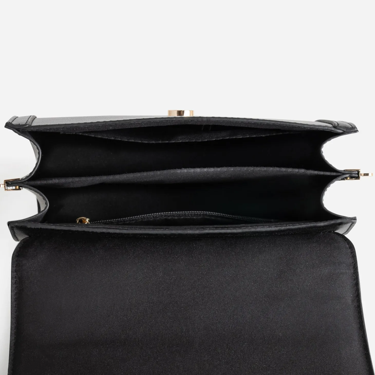 L’atout de ce sac à main pour femme, ce sont ces deux compartiments, dotés de poches internes, dont une zippée, pour une optimisation des rangements. Appréciez son format rectangulaire, idéal au quotidien, sa matière synthétique lisse noire, pour un style sobre et intemporel. Le rabat est décoré d’une large patte avec boucle en métal doré, en écho aux métalleries des côtés. La bandoulière, réglable pour un porté ajusté, est aussi amovible, pour être remplacée par un modèle à motif ethnique, floral ou animalier. Un sac aussi à l’aise en journée qu’en soirée.