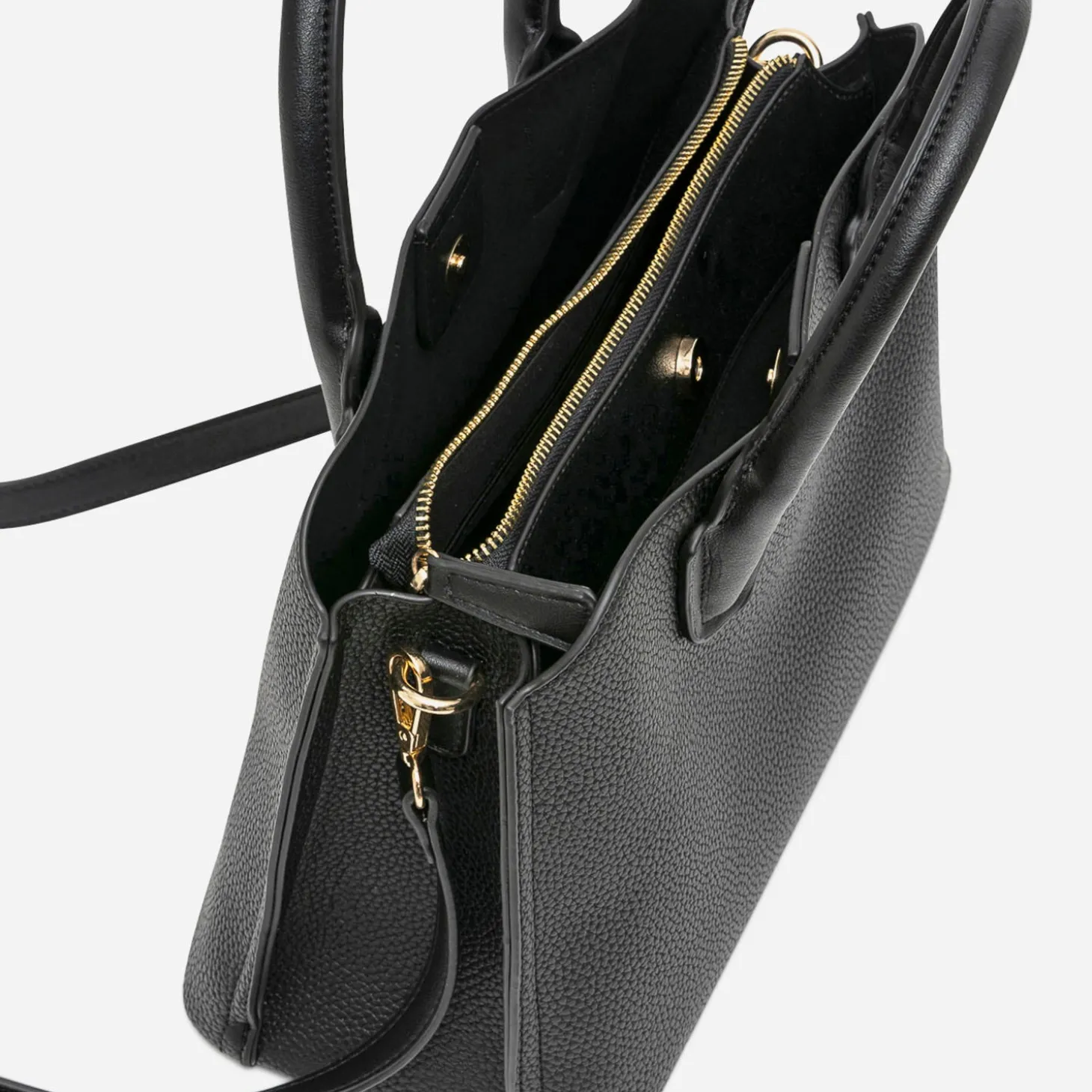 C’est LE sac parfait. Explications. Un format moyen, idéal au quotidien. Un coloris noir, qui matche avec tout. Une matière synthétique avec finition grenée. 3 compartiments, dont 1 central, fermé par zip. Des poches internes, dont 1 zippée. 2 anses courtes, à poser sur l’avant-bras. Une bandoulière réglable et amovible, à poser sur l’épaule ou croisée. Son design et son utilisation sont étudiés pour une utilisation optimale, tout au long de la saison.